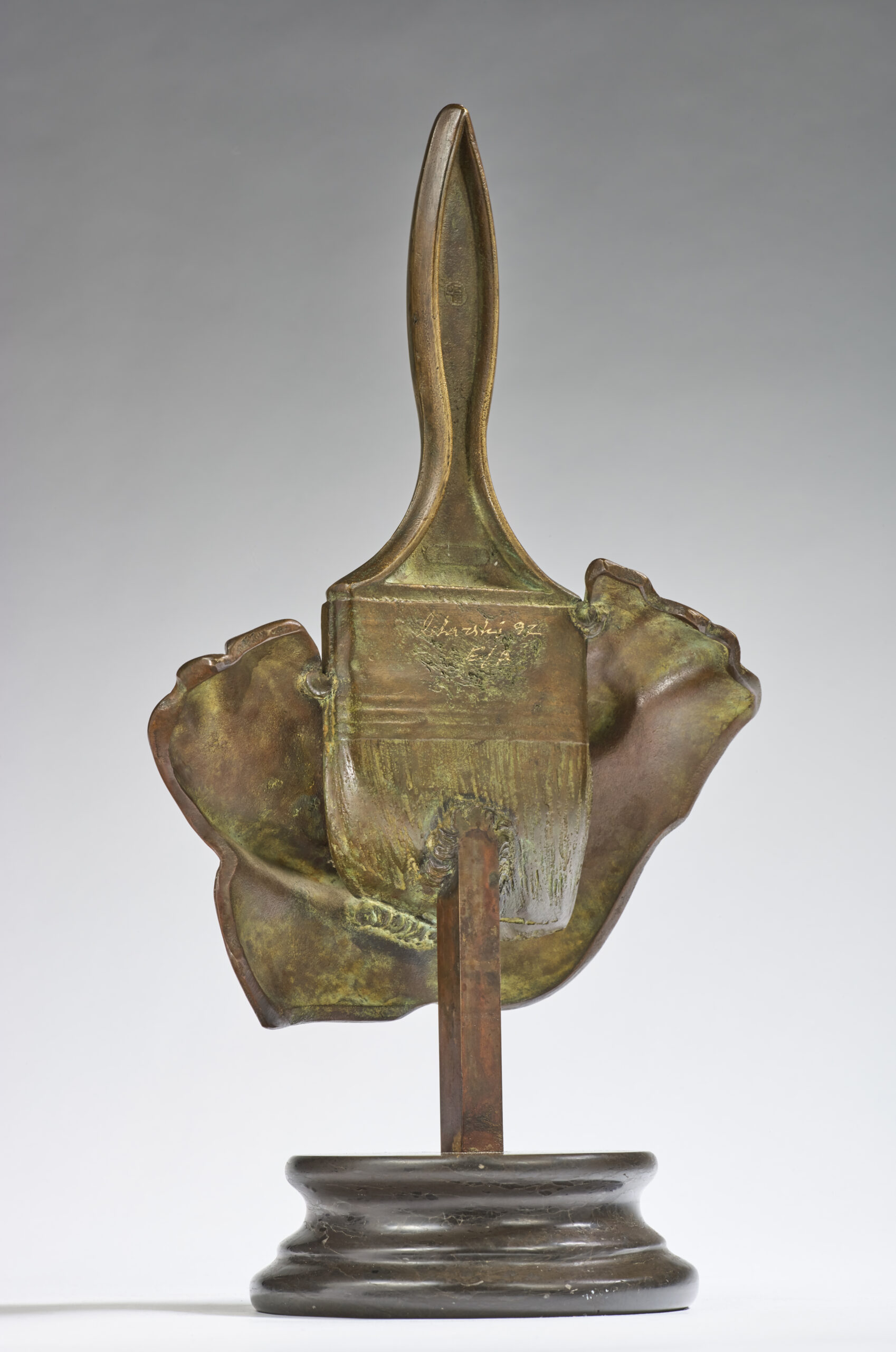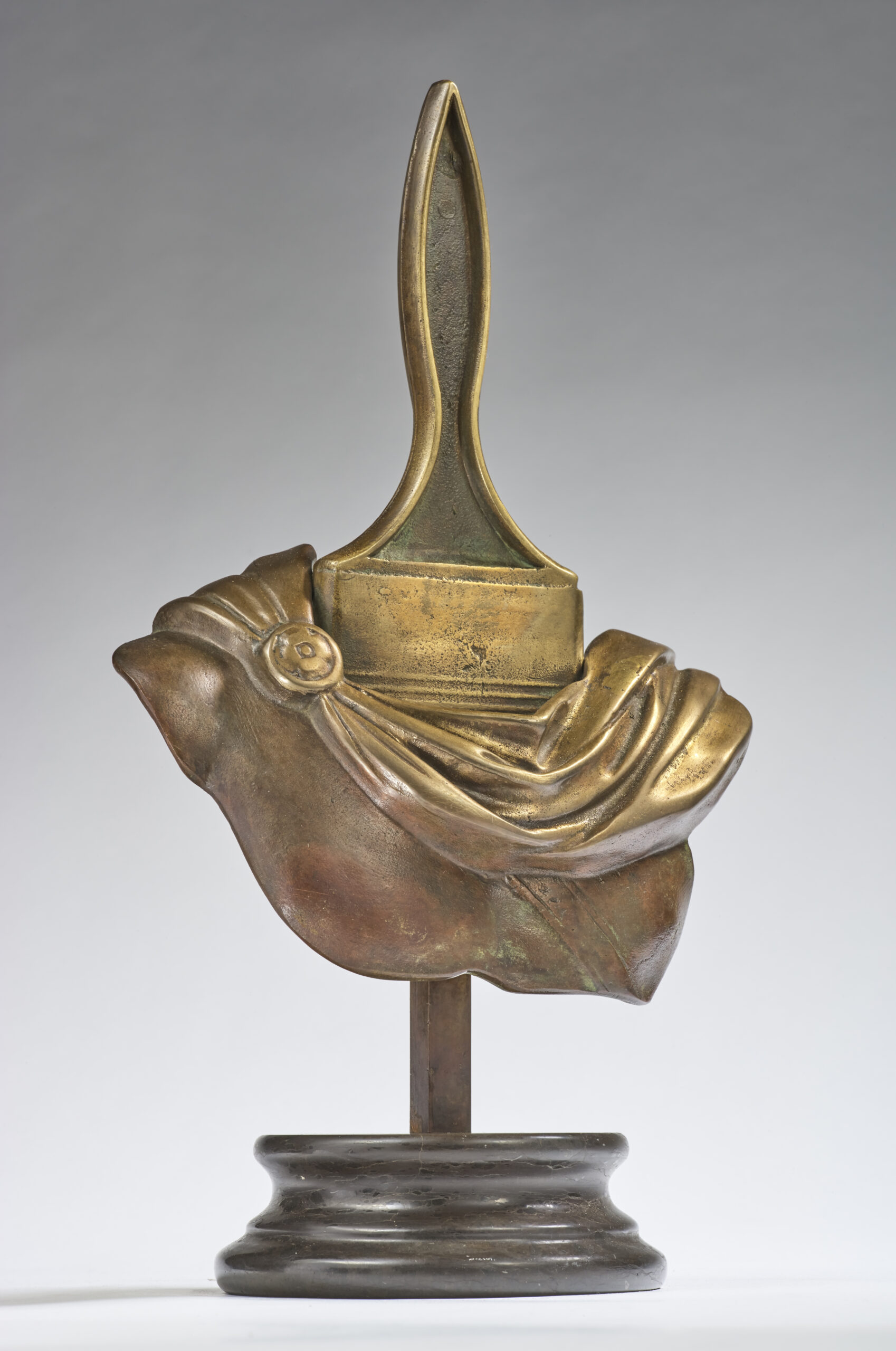 Buste stylisé en bronze, drapé et coiffé d’un pinceau, présenté sur une base en marbre.