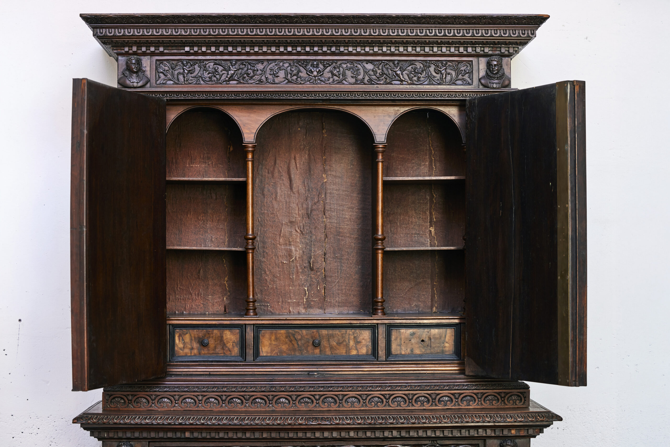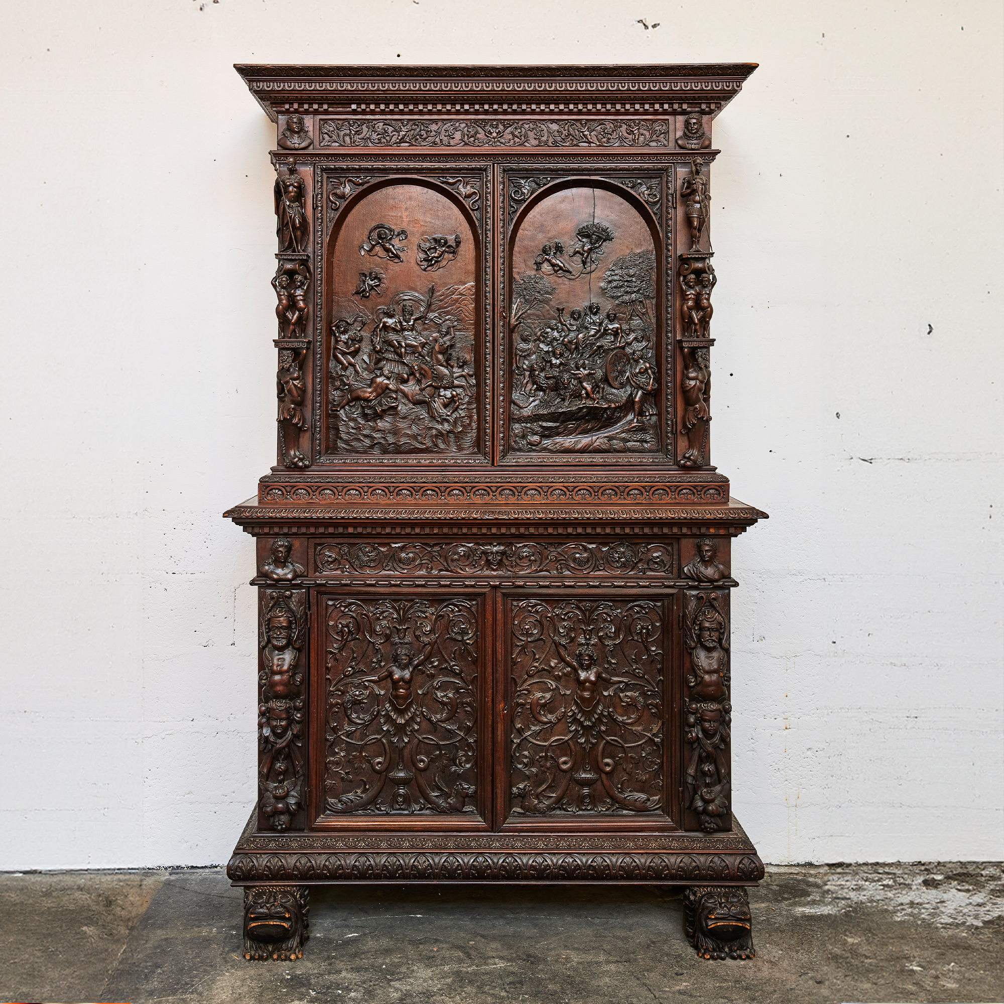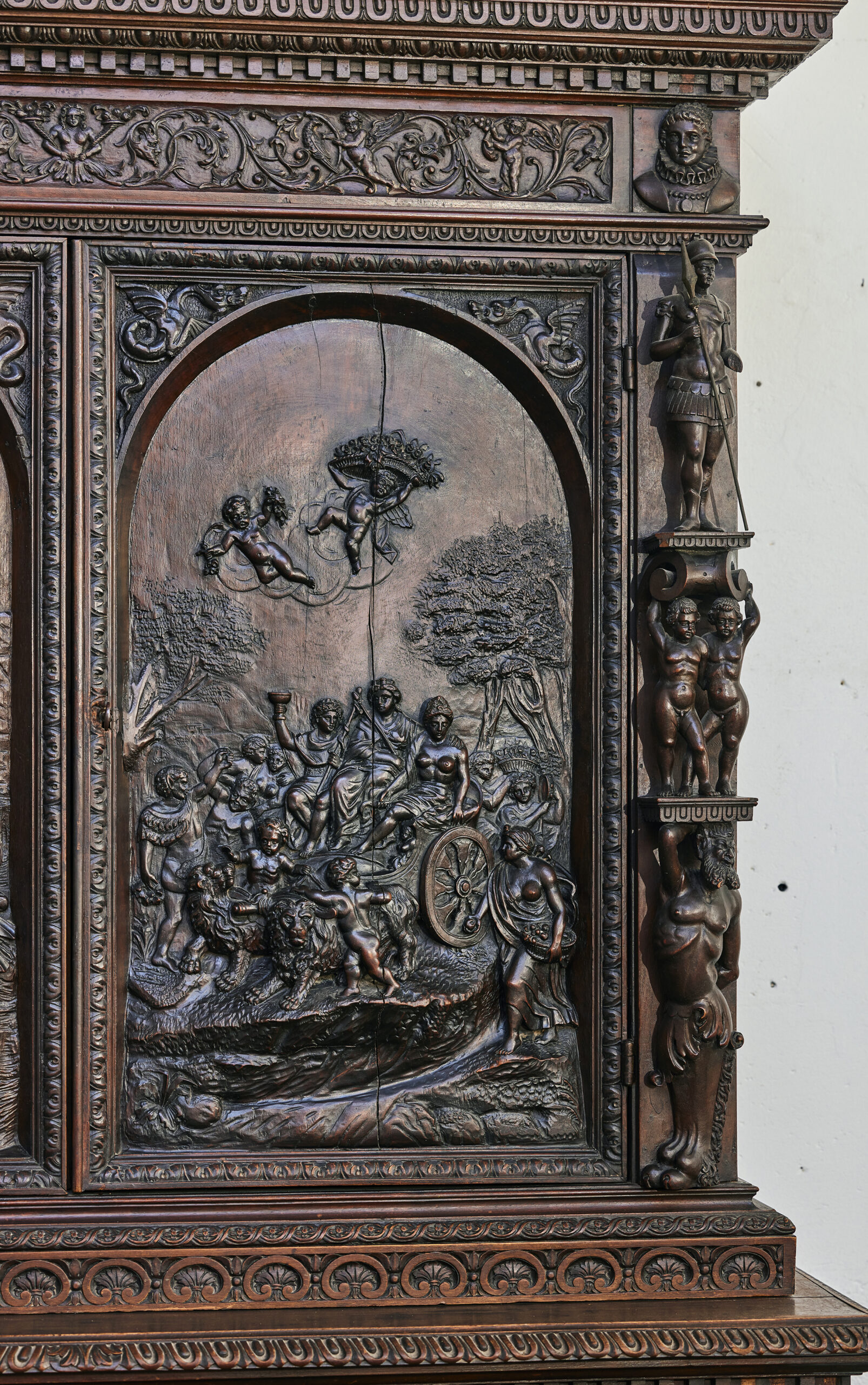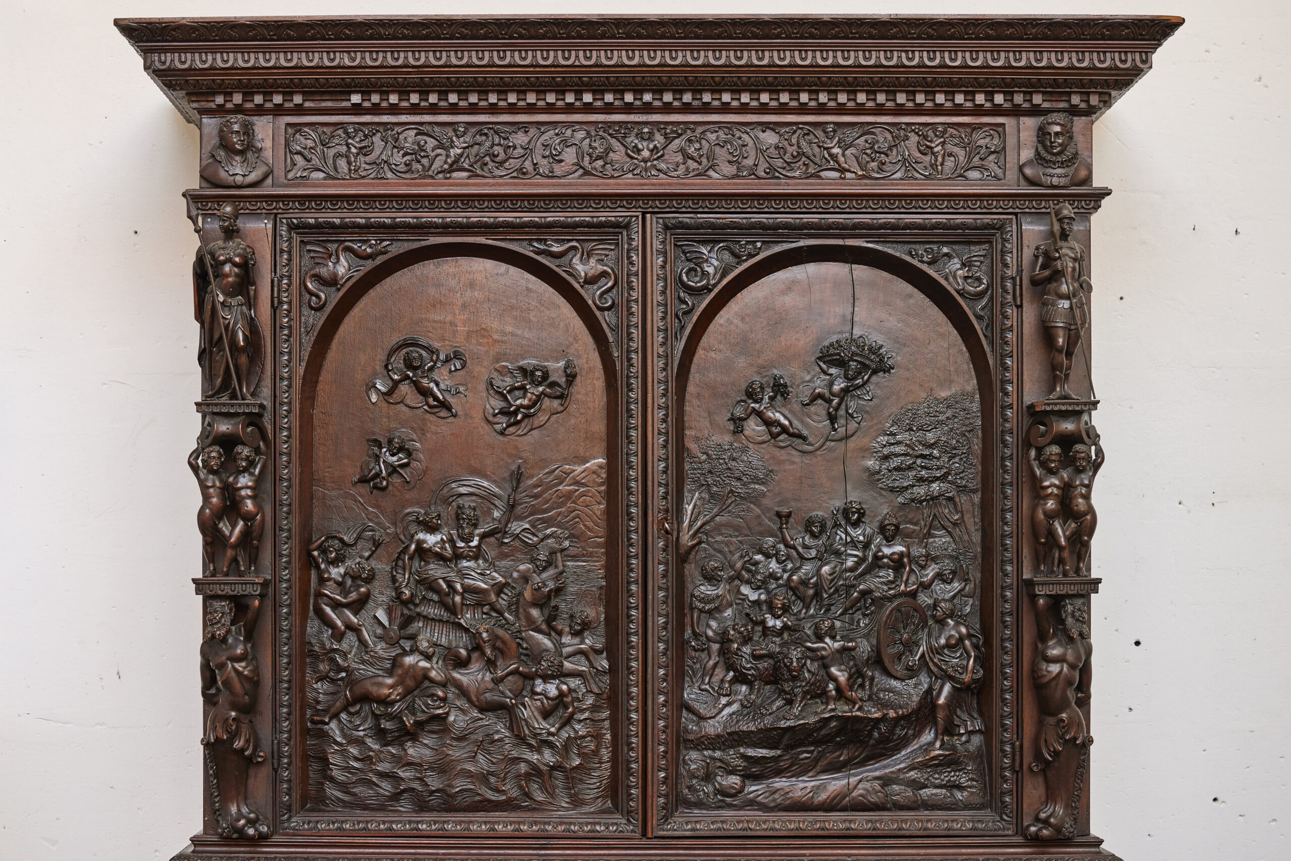 Les armoires sculptées en noyer constituent l’un des grands témoins du mobilier européen entre les XVIIᵉ et XIXᵉ siècles. Leur décor narratif ou allégorique — souvent inspiré de l’iconographie religieuse, mythologique ou royale — reflète le statut social de leurs commanditaires. Le noyer, apprécié pour sa densité et sa capacité à rendre les détails, était le bois privilégié des ateliers régionaux en France comme en Europe du Nord. Ces pièces, réalisées sur plusieurs générations, illustrent l’évolution des styles du baroque tardif aux influences historicistes du XIXᵉ siècle.
