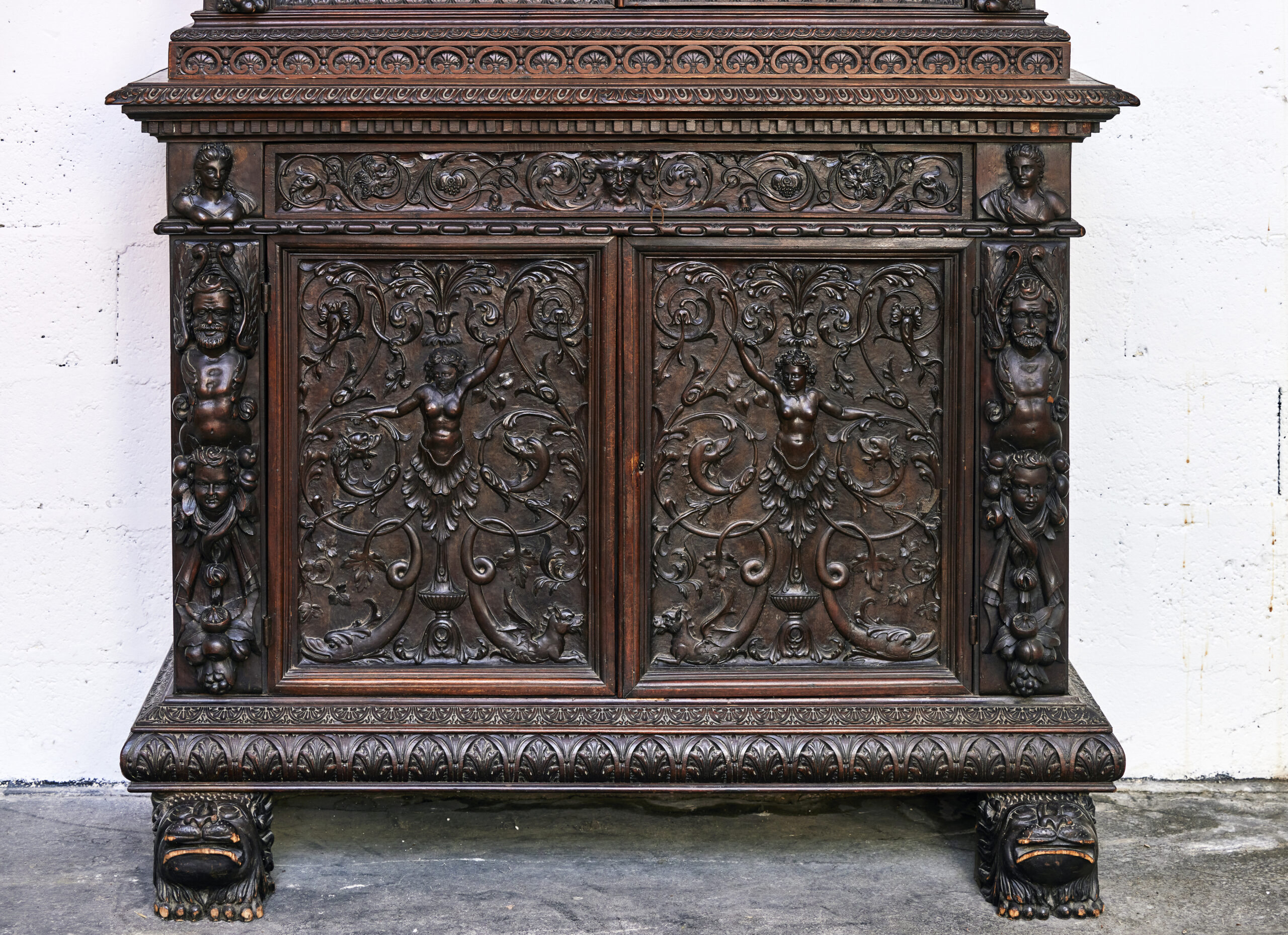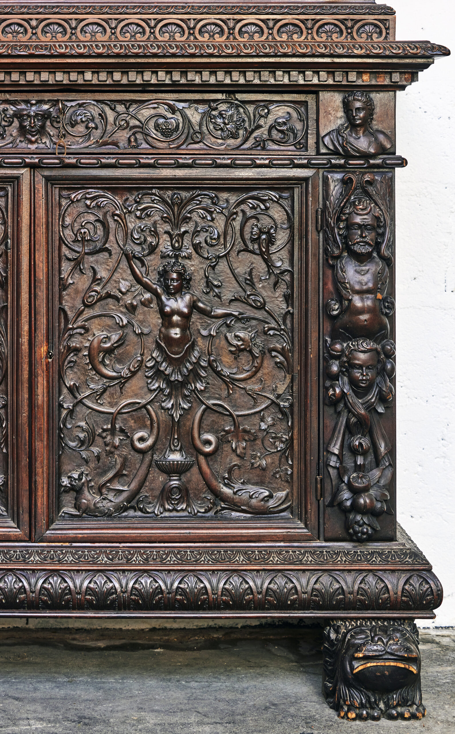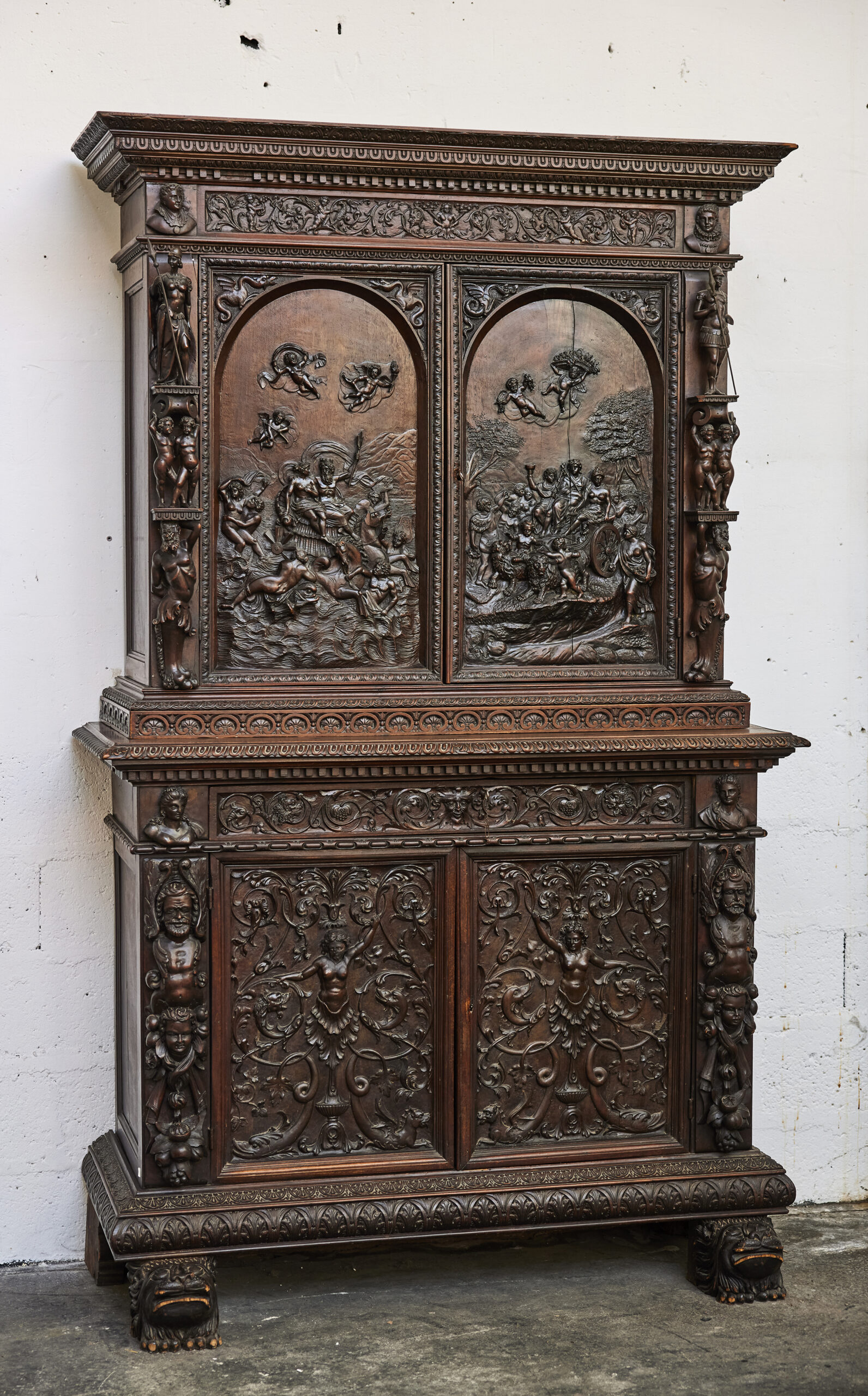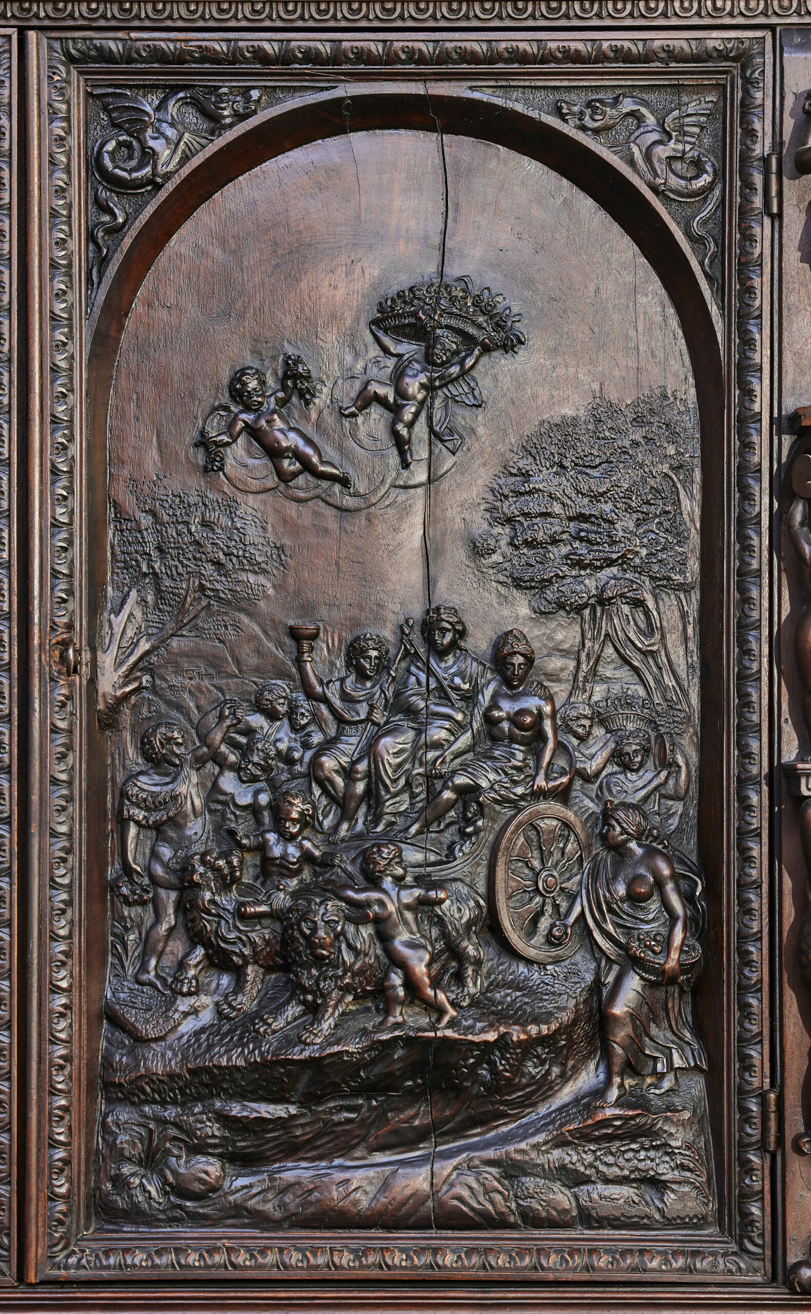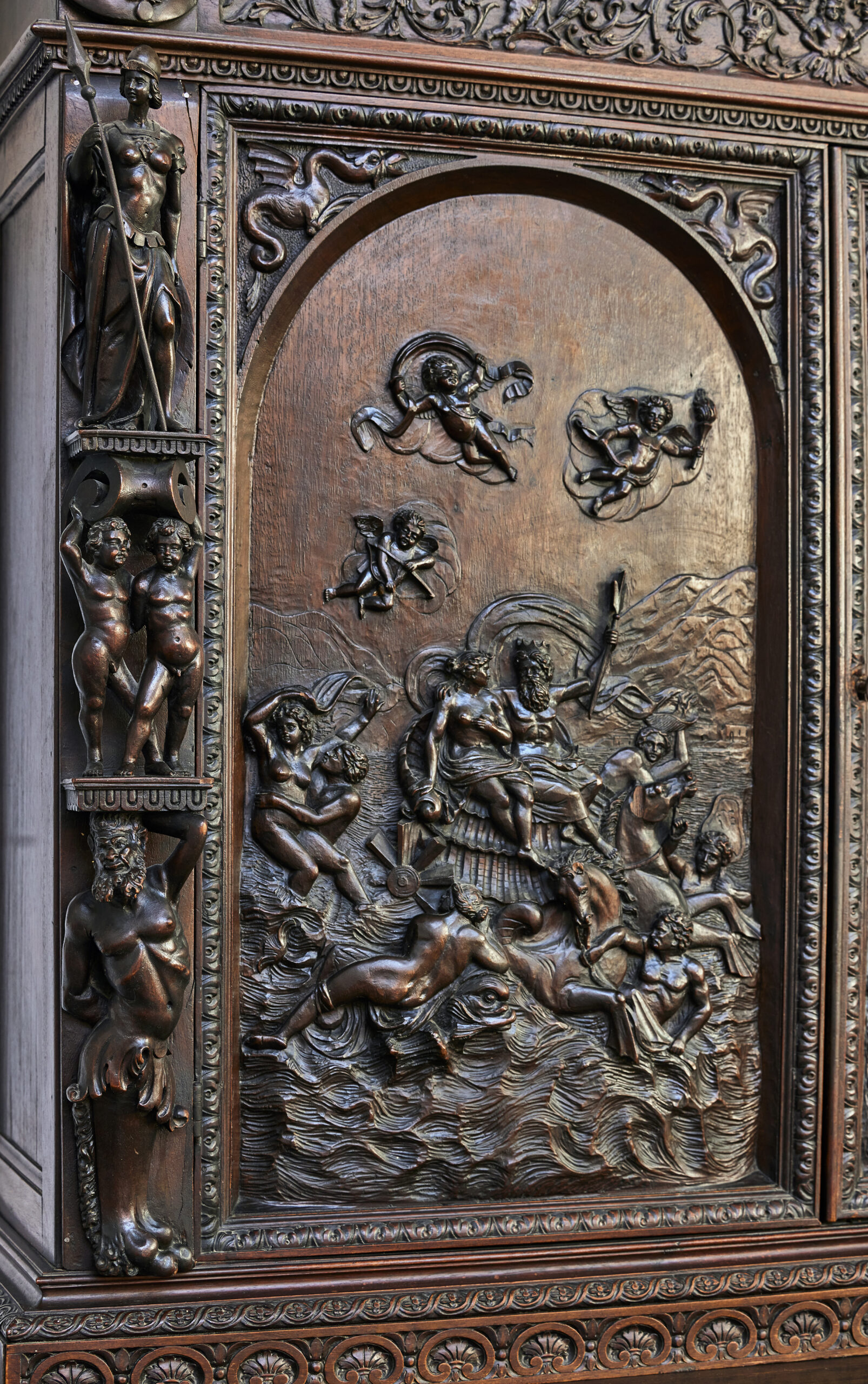 Les armoires sculptées en noyer constituent l’un des grands témoins du mobilier européen entre les XVIIᵉ et XIXᵉ siècles. Leur décor narratif ou allégorique — souvent inspiré de l’iconographie religieuse, mythologique ou royale — reflète le statut social de leurs commanditaires. Le noyer, apprécié pour sa densité et sa capacité à rendre les détails, était le bois privilégié des ateliers régionaux en France comme en Europe du Nord. Ces pièces, réalisées sur plusieurs générations, illustrent l’évolution des styles du baroque tardif aux influences historicistes du XIXᵉ siècle.