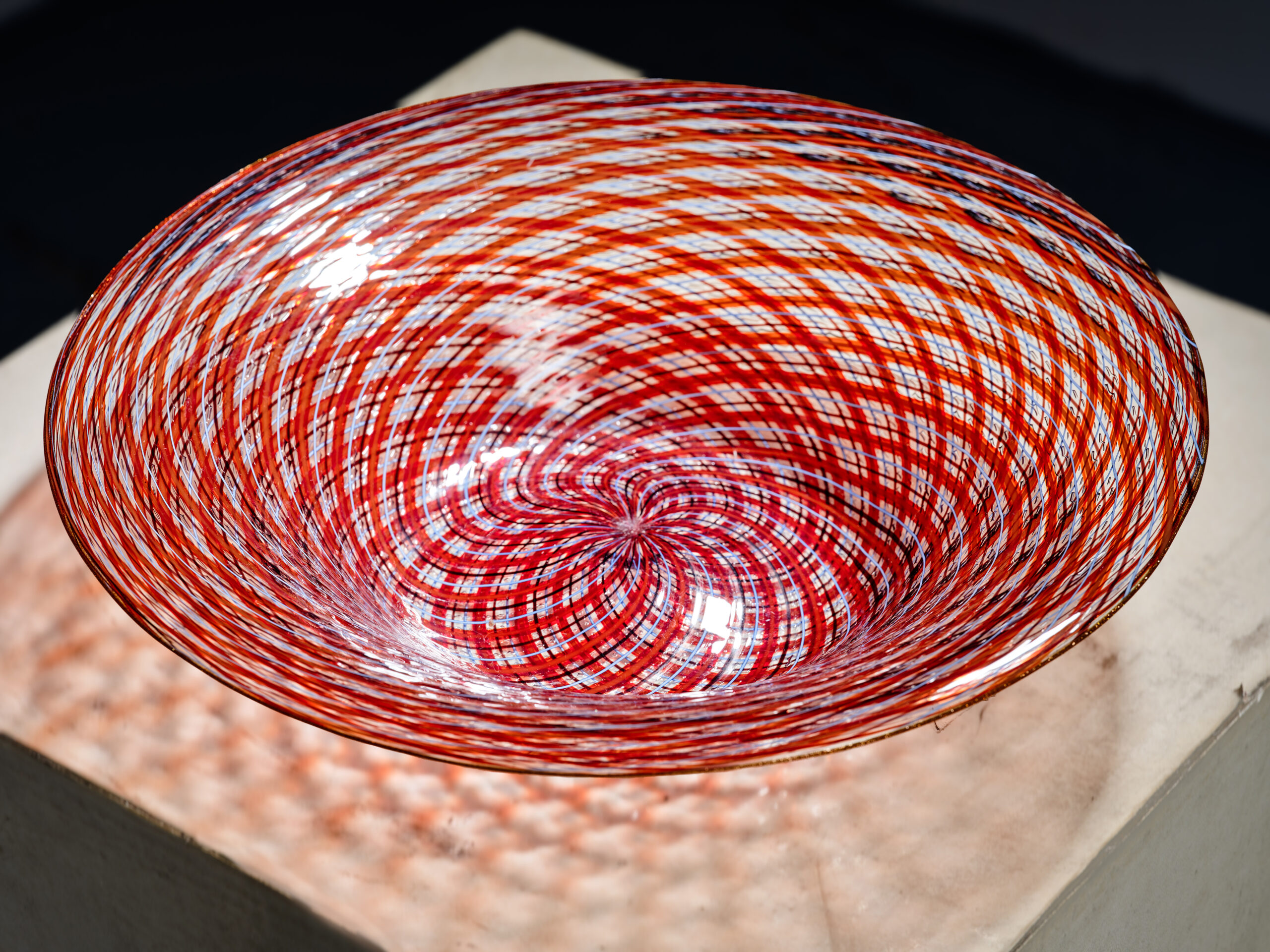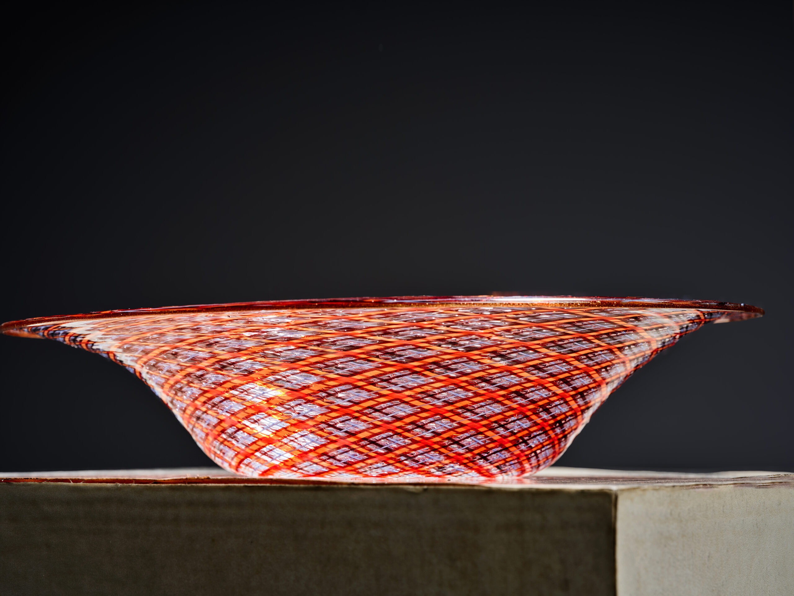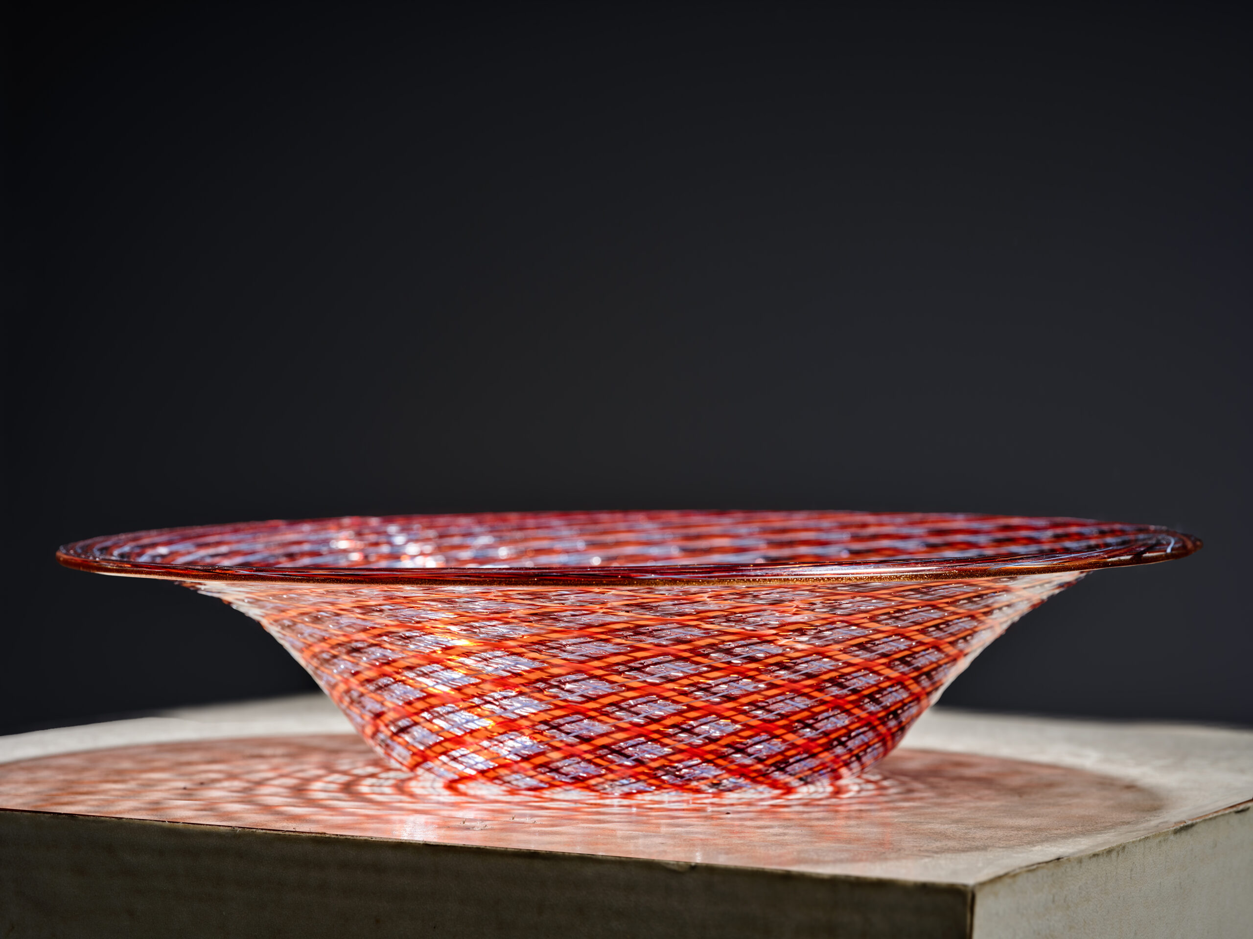 Grande coupe en verre soufflé réalisée selon la technique du reticello avec cannes de verre alternées. Exemple représentatif du savoir-faire verrier développé à Murano dans l’entre-deux-guerres.
