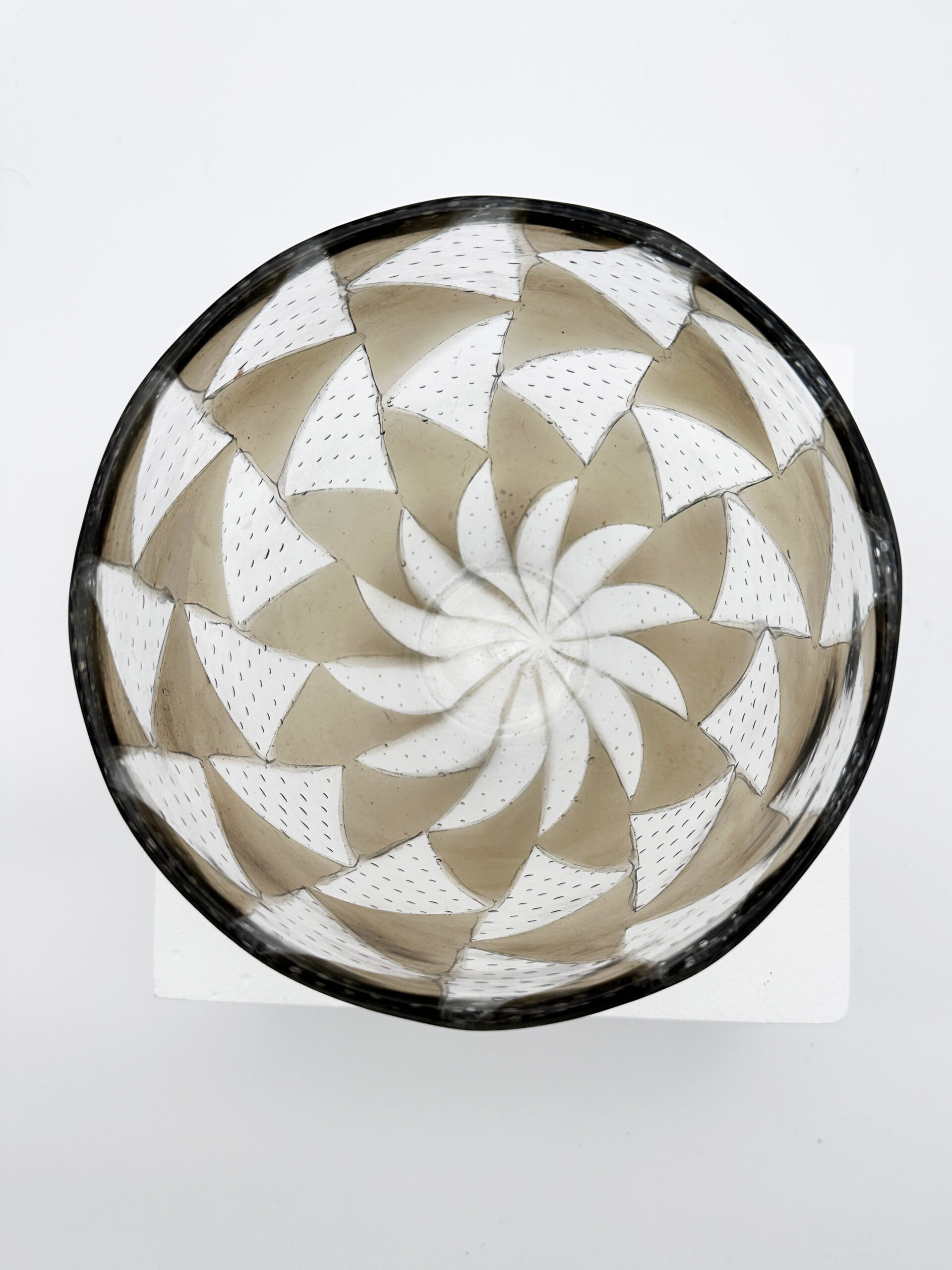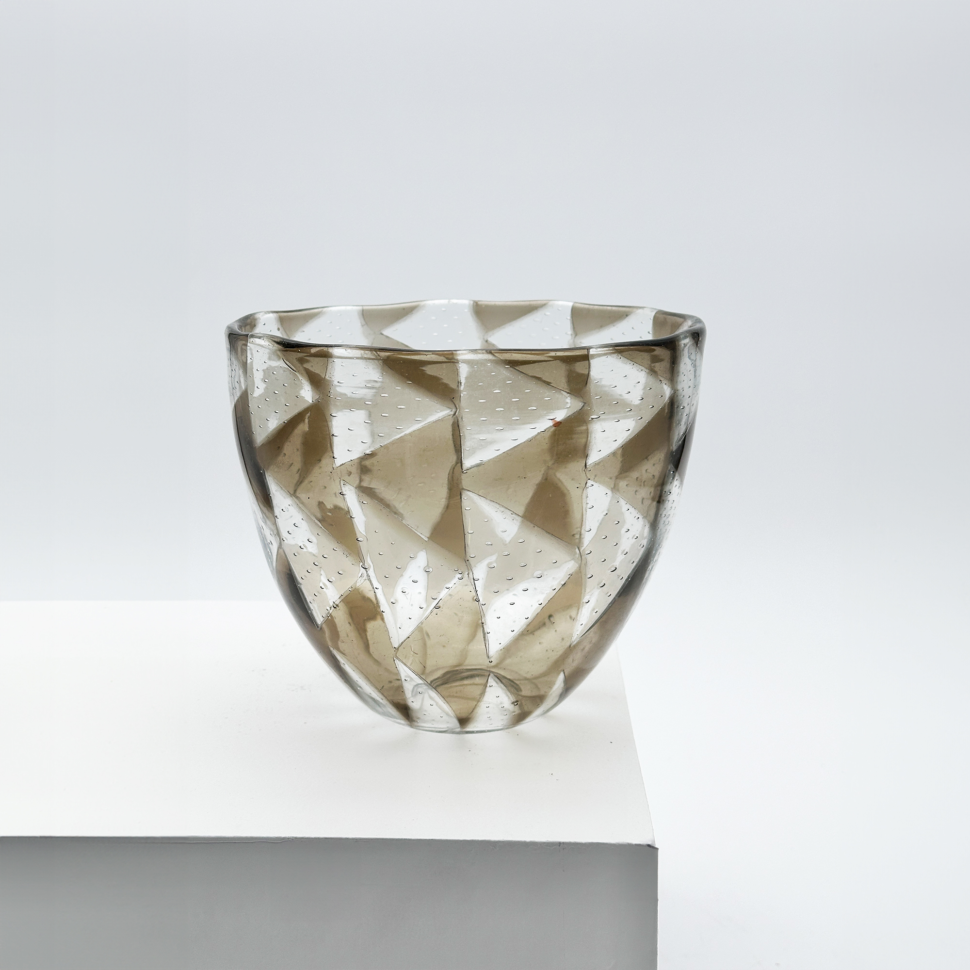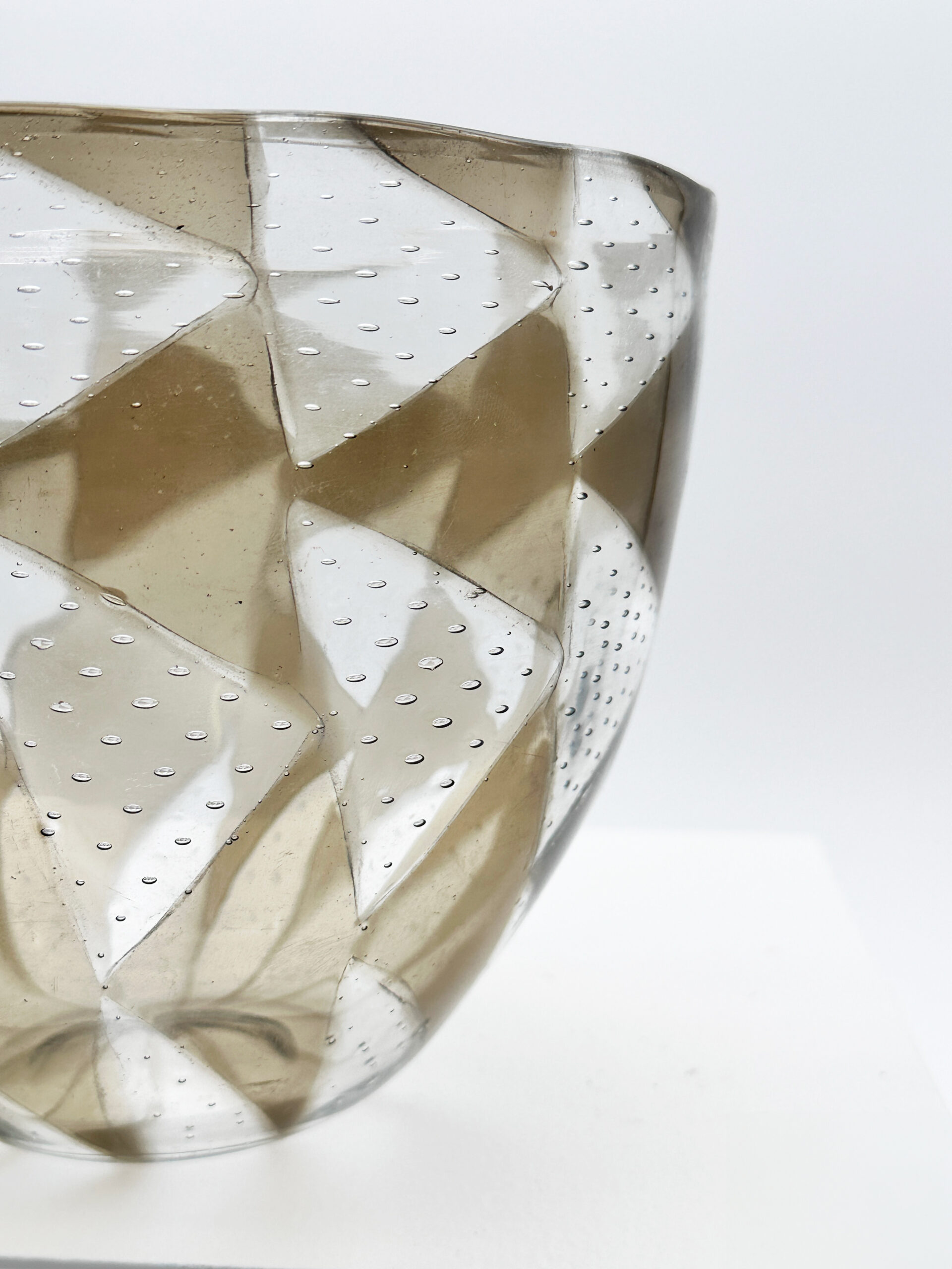 Coupe en verre soufflé à motifs géométriques triangulaires “Intarsio”, de couleur ambre et transparente, avec inclusion de bulles