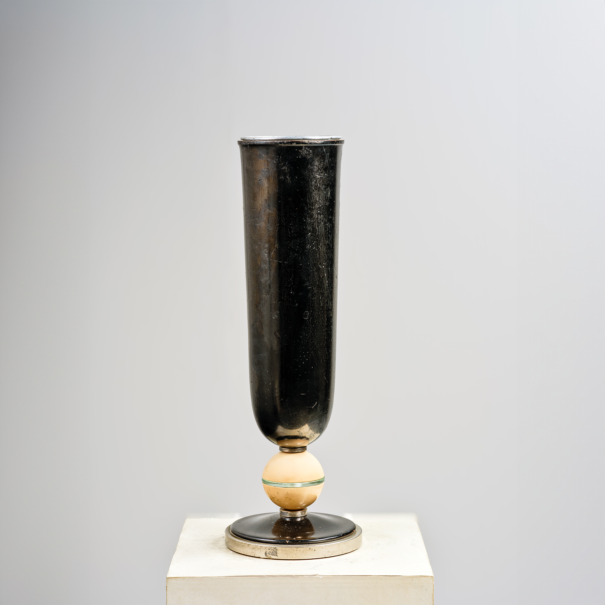Rare et grande lampe en ébène de forme balustre, reposant sur une sphère de bois laqué ivoire agrémentée d’un disque de verre, l’ensemble posé sur une base en métal nickelé.