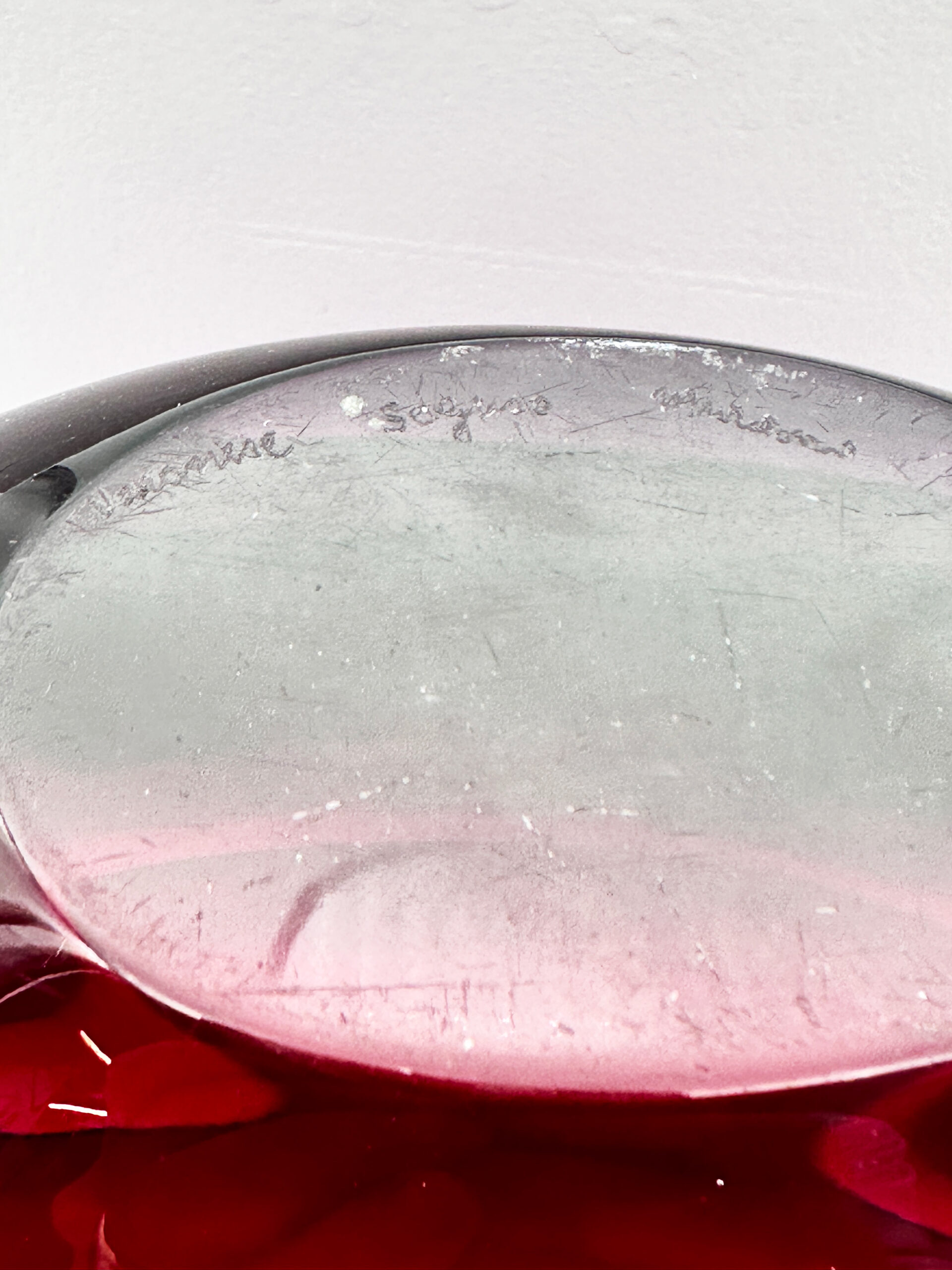 Flavio Poli, grande figure du verre italien, collabore avec plusieurs verreries majeures, dont Seguso et Veronese. Ses créations sommerso illustrent sa maîtrise exceptionnelle des superpositions de verre coloré et des dégradés. Il reste l’un des artistes les plus influents du design verrier italien du milieu du XXᵉ siècle.