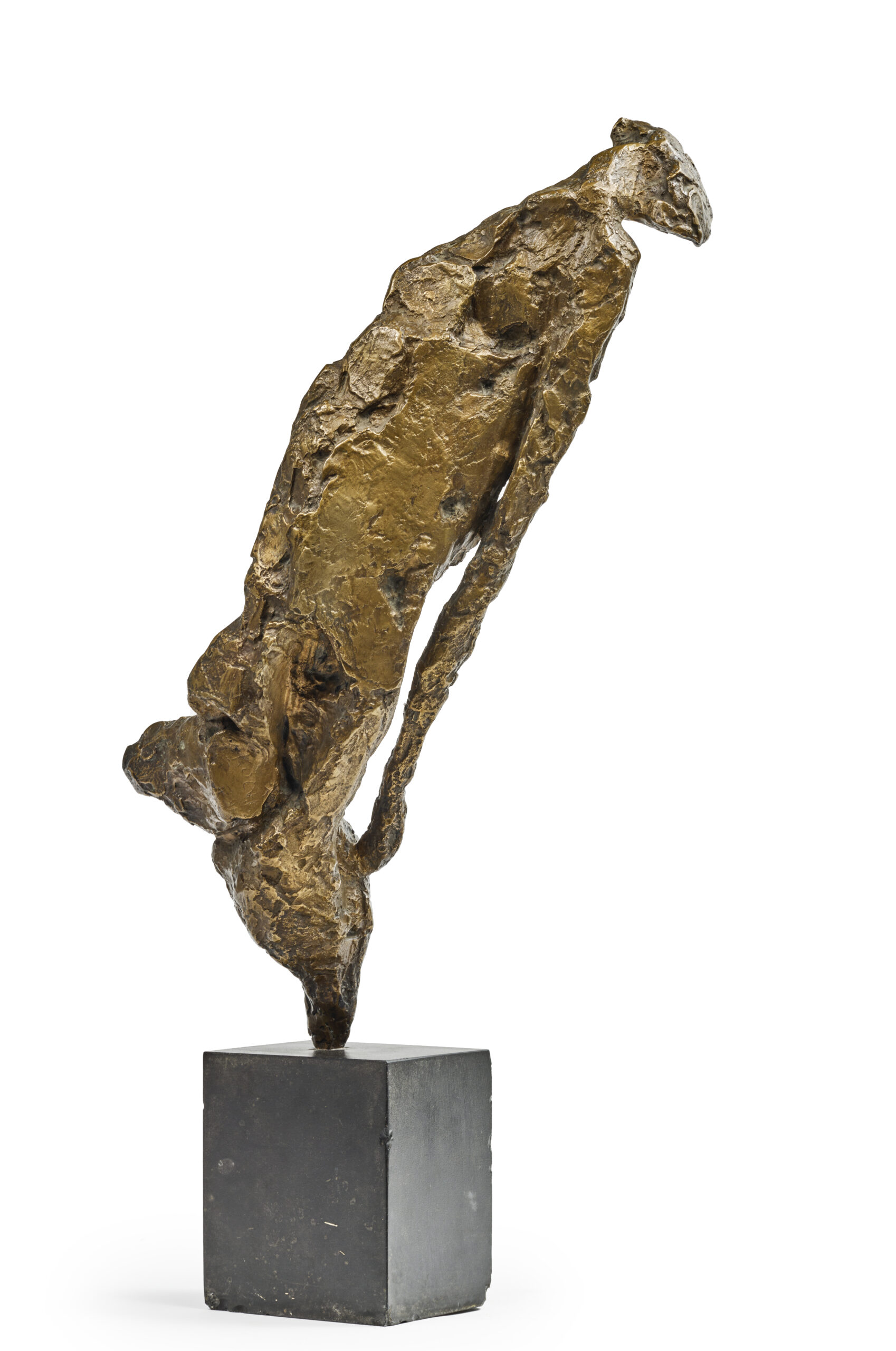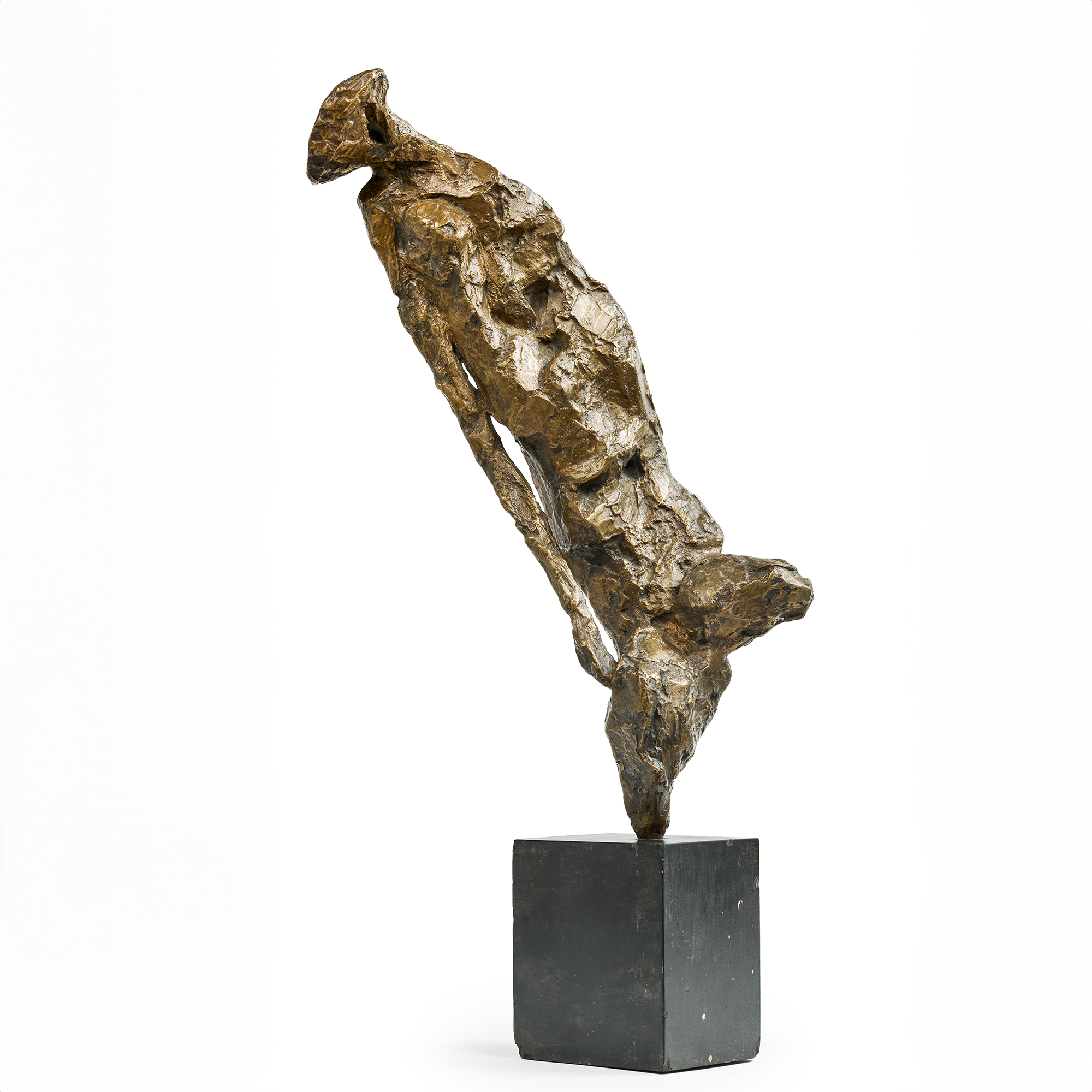 Figure inclinée en bronze reposant sur une base en ardoise.