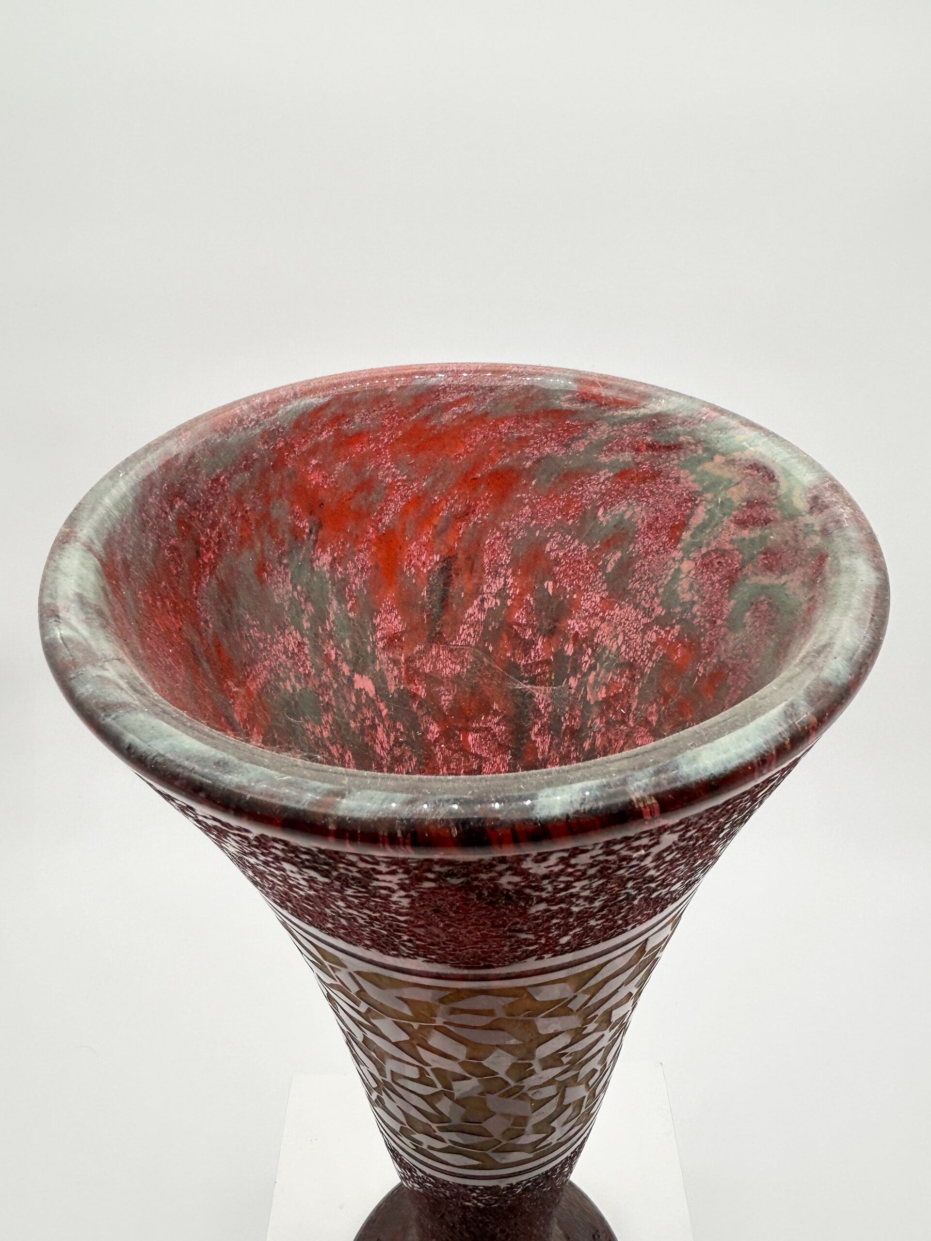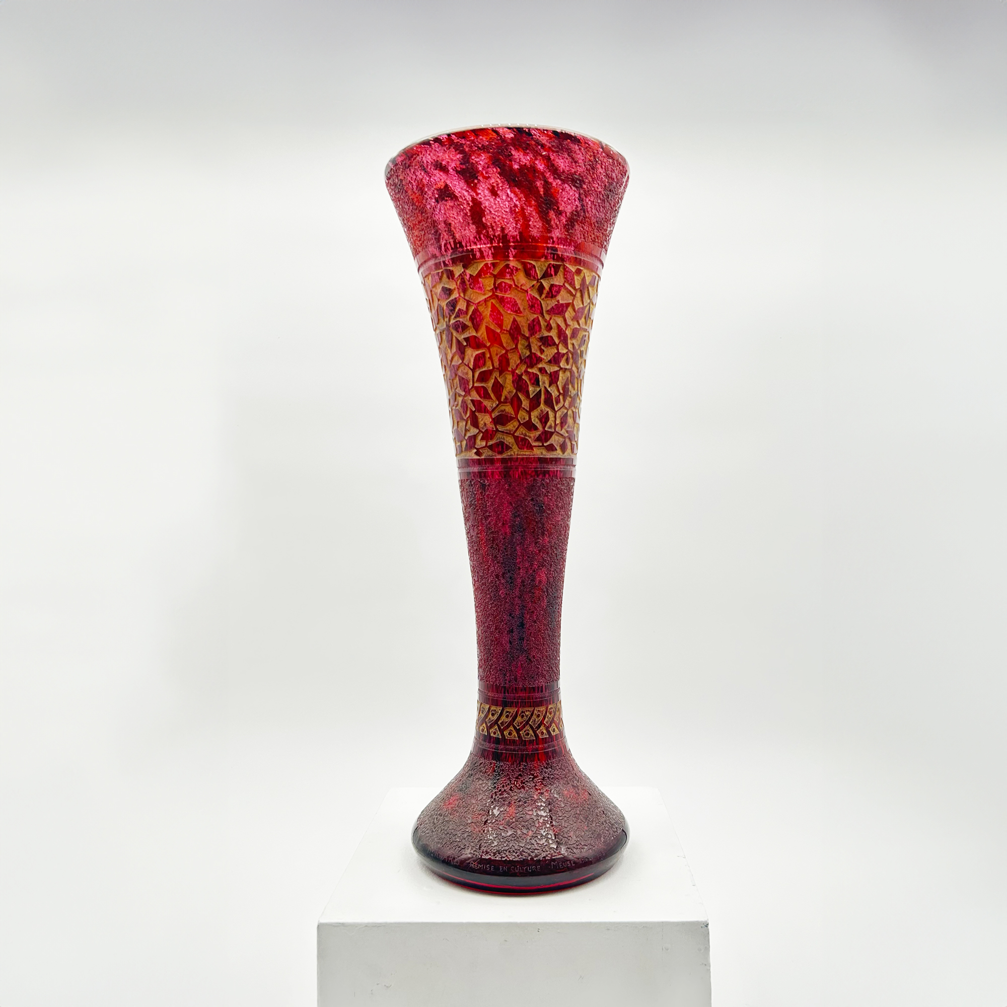 Important vase cornet en verre épais mauve, décoré de motifs feuillagés stylisés dégagés à l’acide sur fond granité et rehaussés d’or.