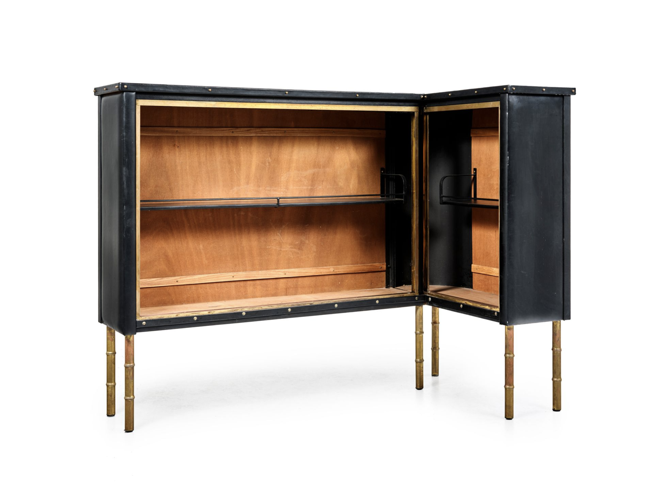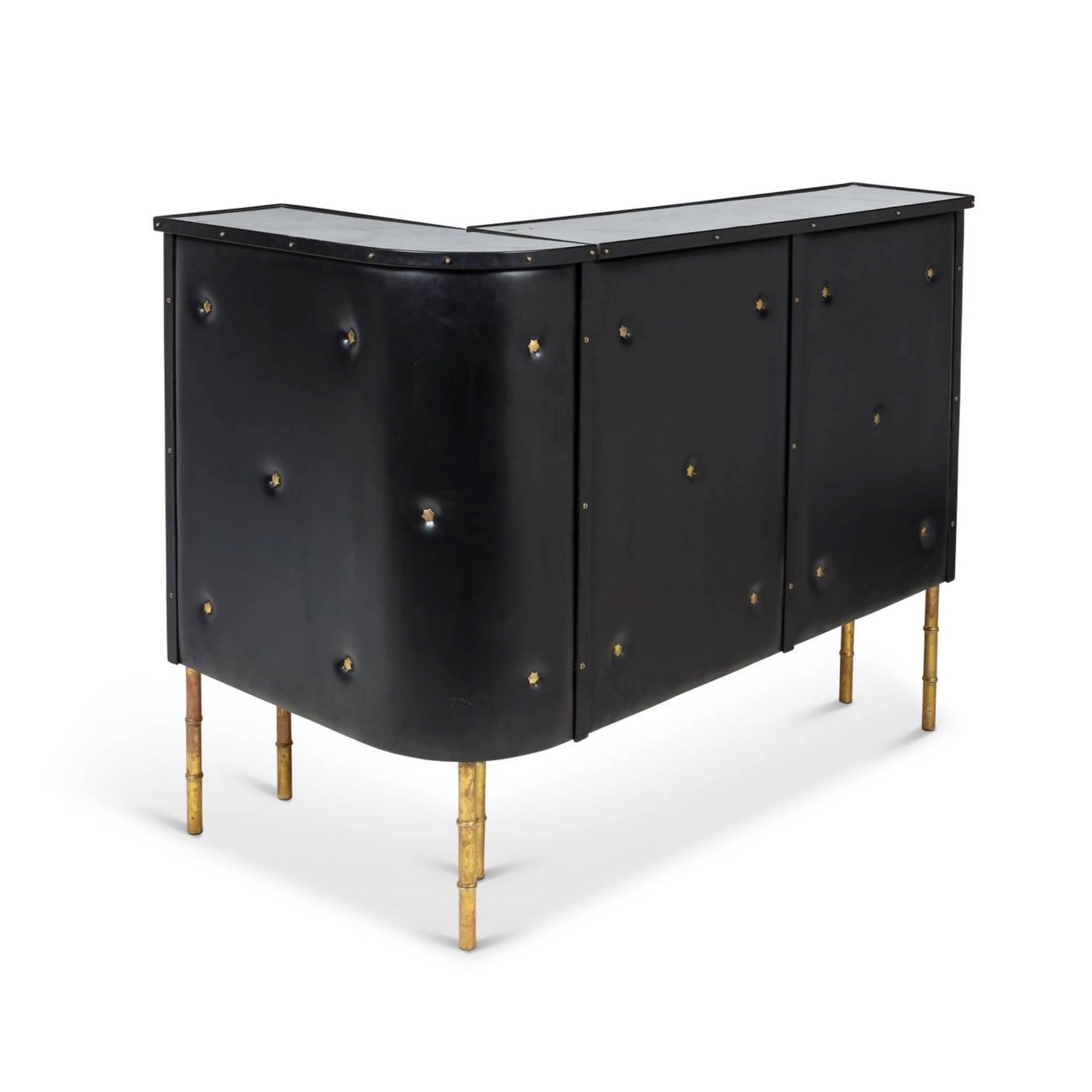 Bar à armature en lames de métal formant « L », entièrement recouvert de cuir et de skaï noir capitonné, reposant sur six pieds en laiton doré façon bambou