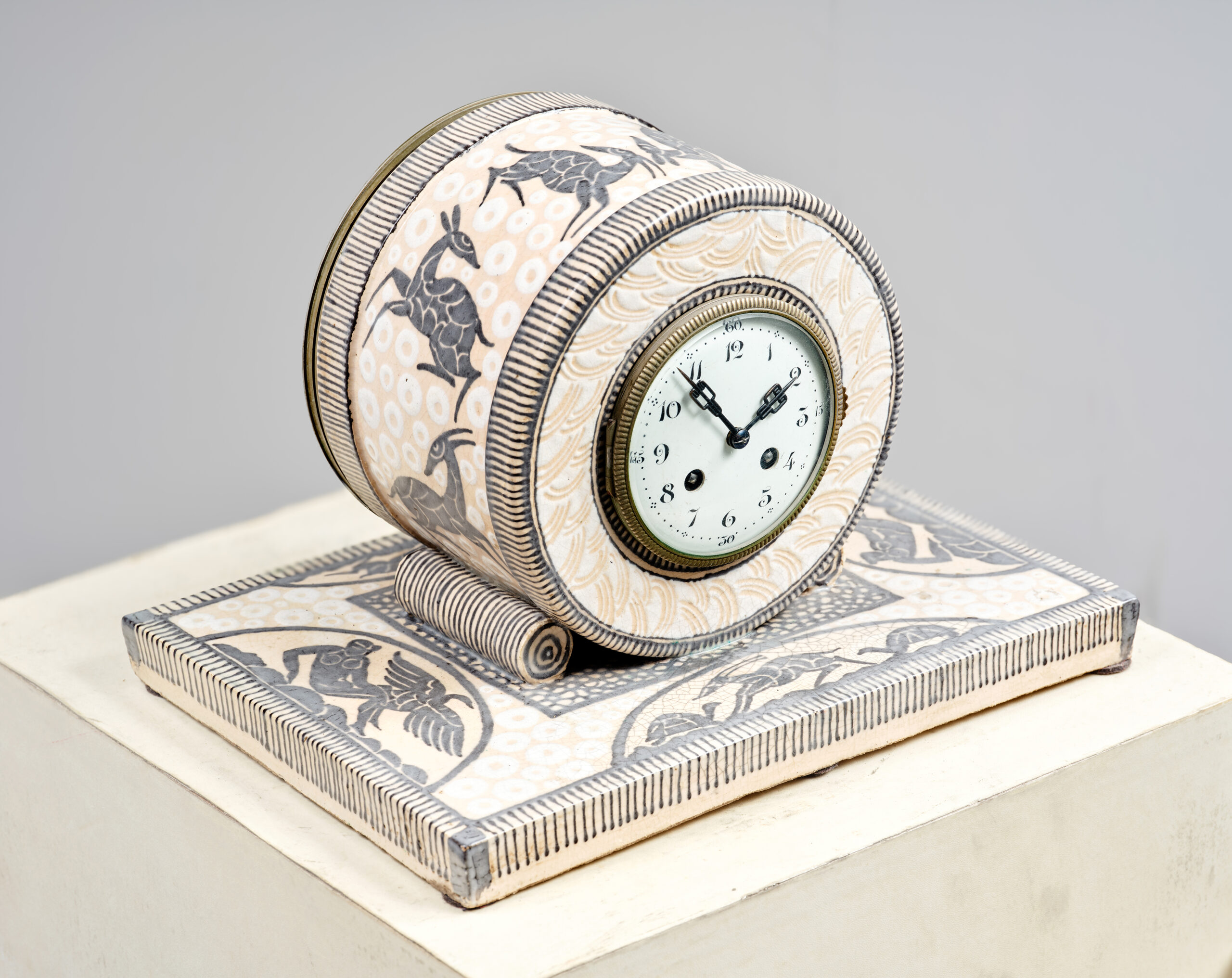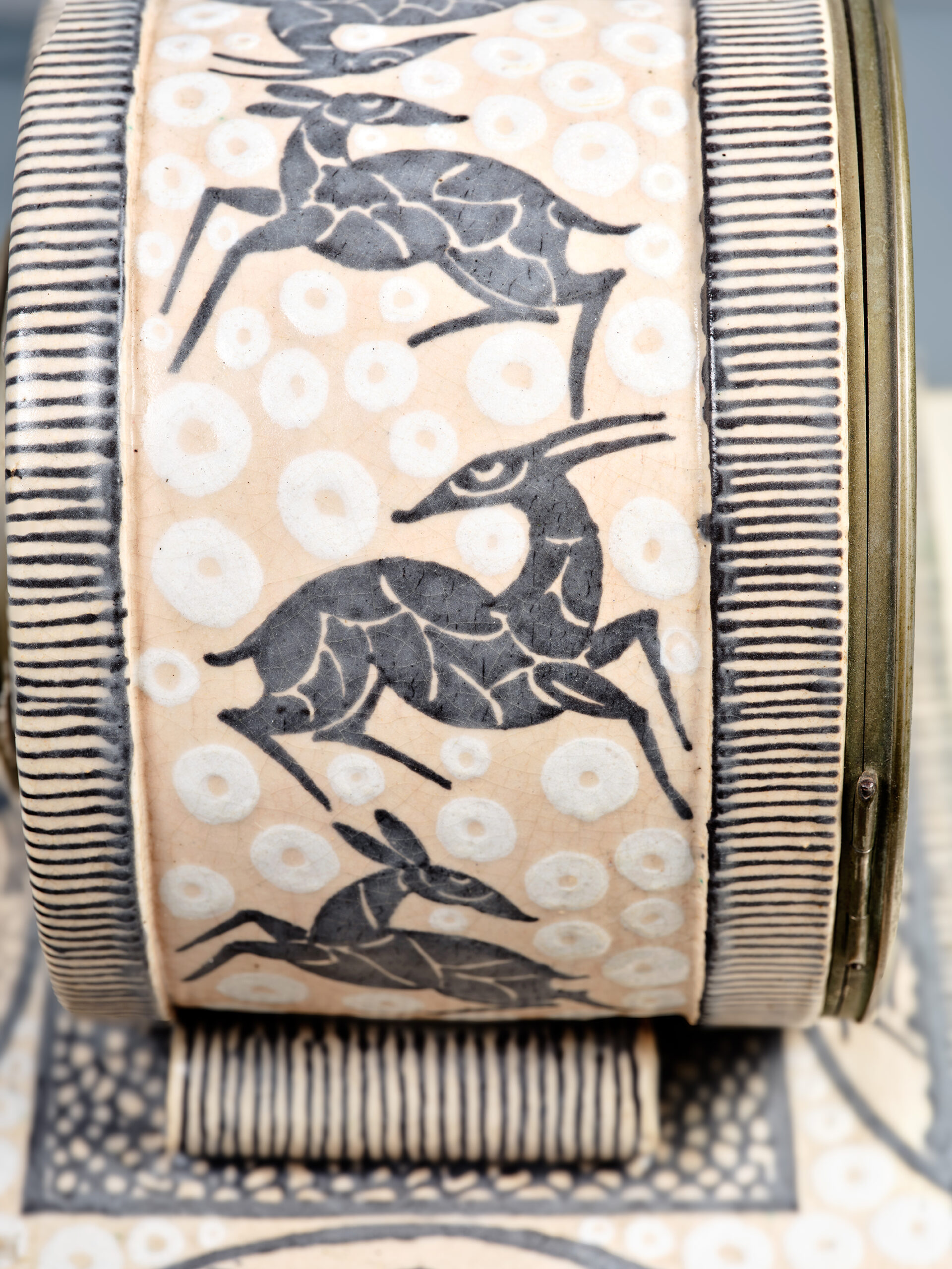 Pendule cylindrique en céramique à décor émaillé représentant Léda et le Cygne, entourée de cervidés et de tortues en grisaille sur fond saumon et blanc