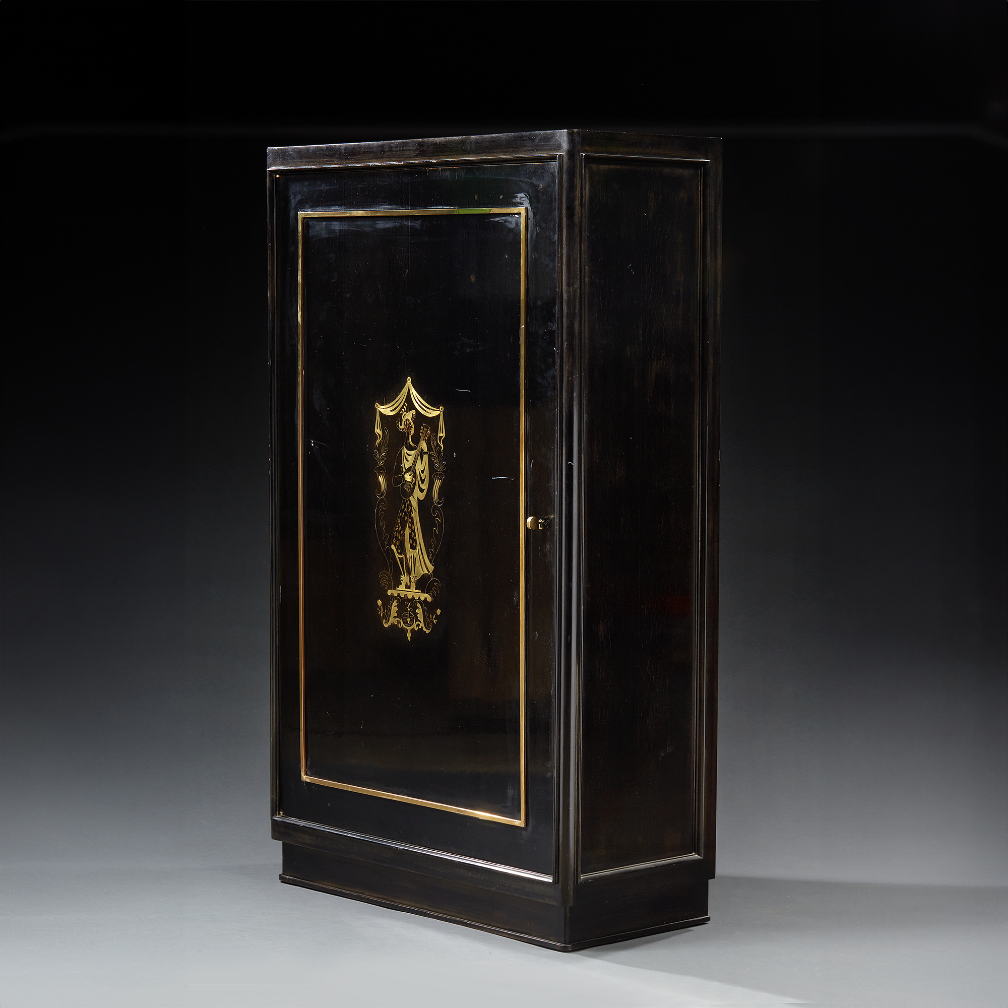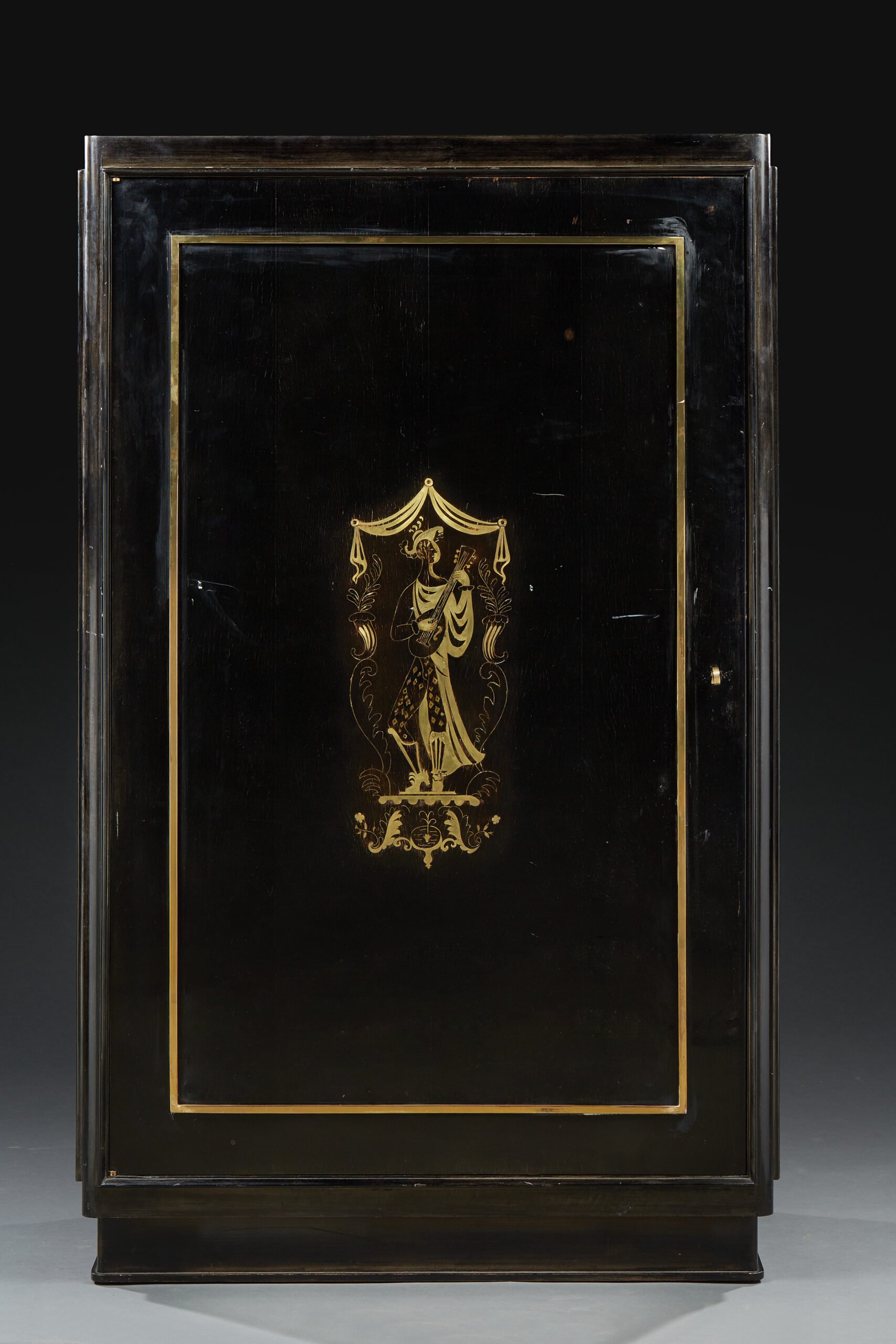 Meuble de rangement à caisson cubique mouluré en bois laqué noir, ouvrant en façade par une porte soulignée d’un jonc en bronze doré et ornée d’un décor marqueté représentant un personnage à la mandoline dans un entourage floral