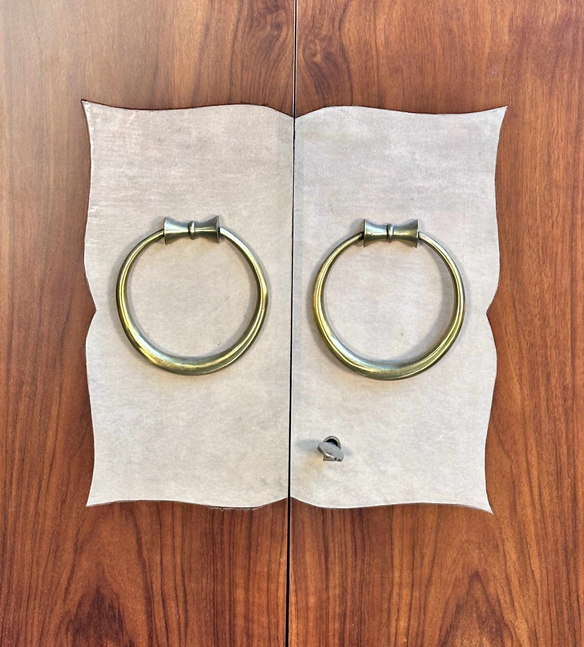Façade agrémentée d’un cartouche en parchemin de forme chantournée, souligné de deux poignées tombantes en laiton
