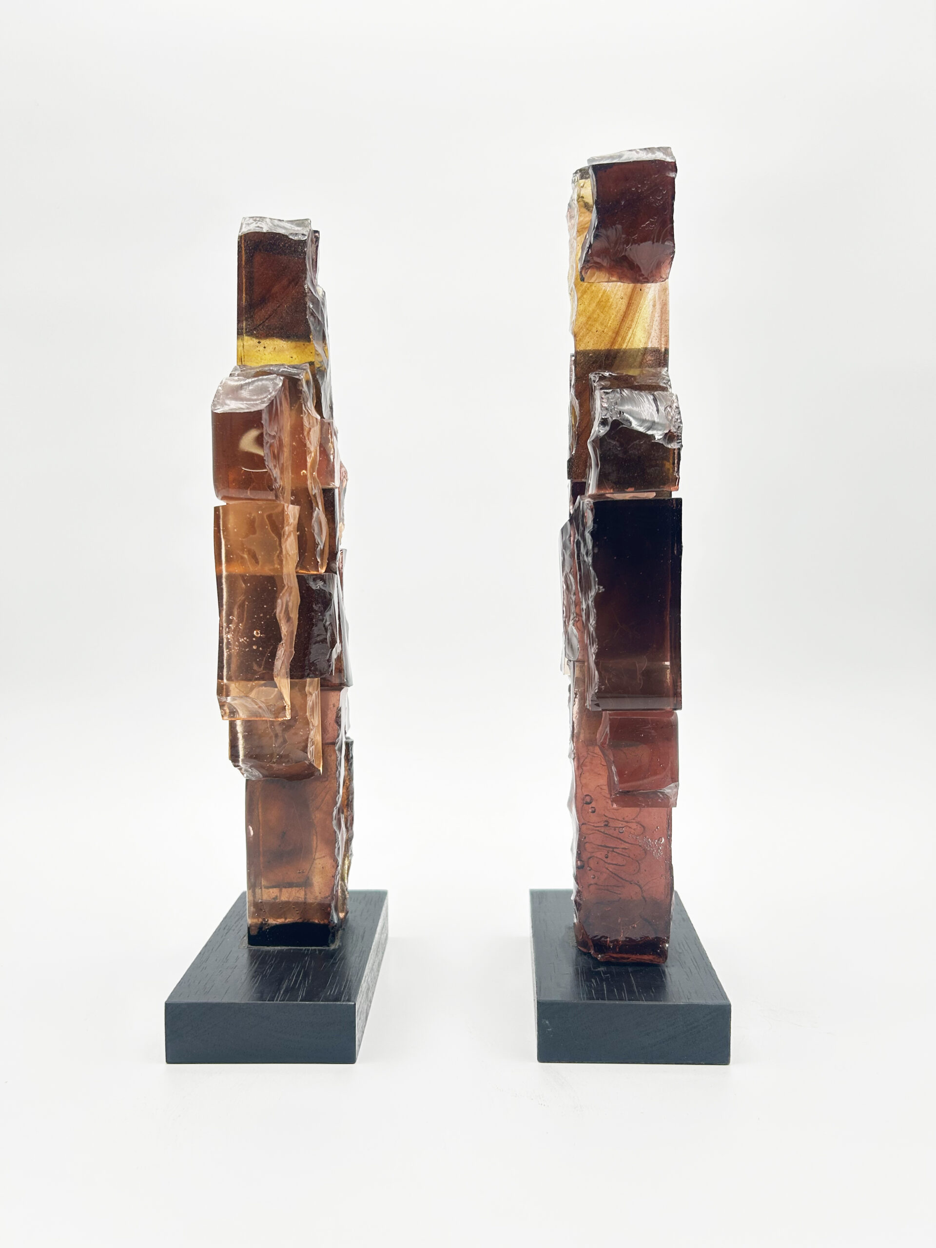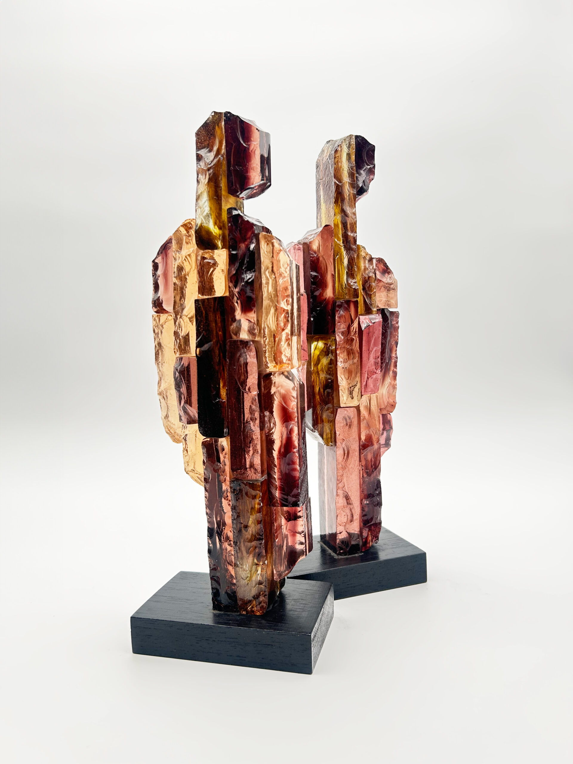 Paire de personnages debout en verre mauve, reposant sur un socle cubique en bois noirci.