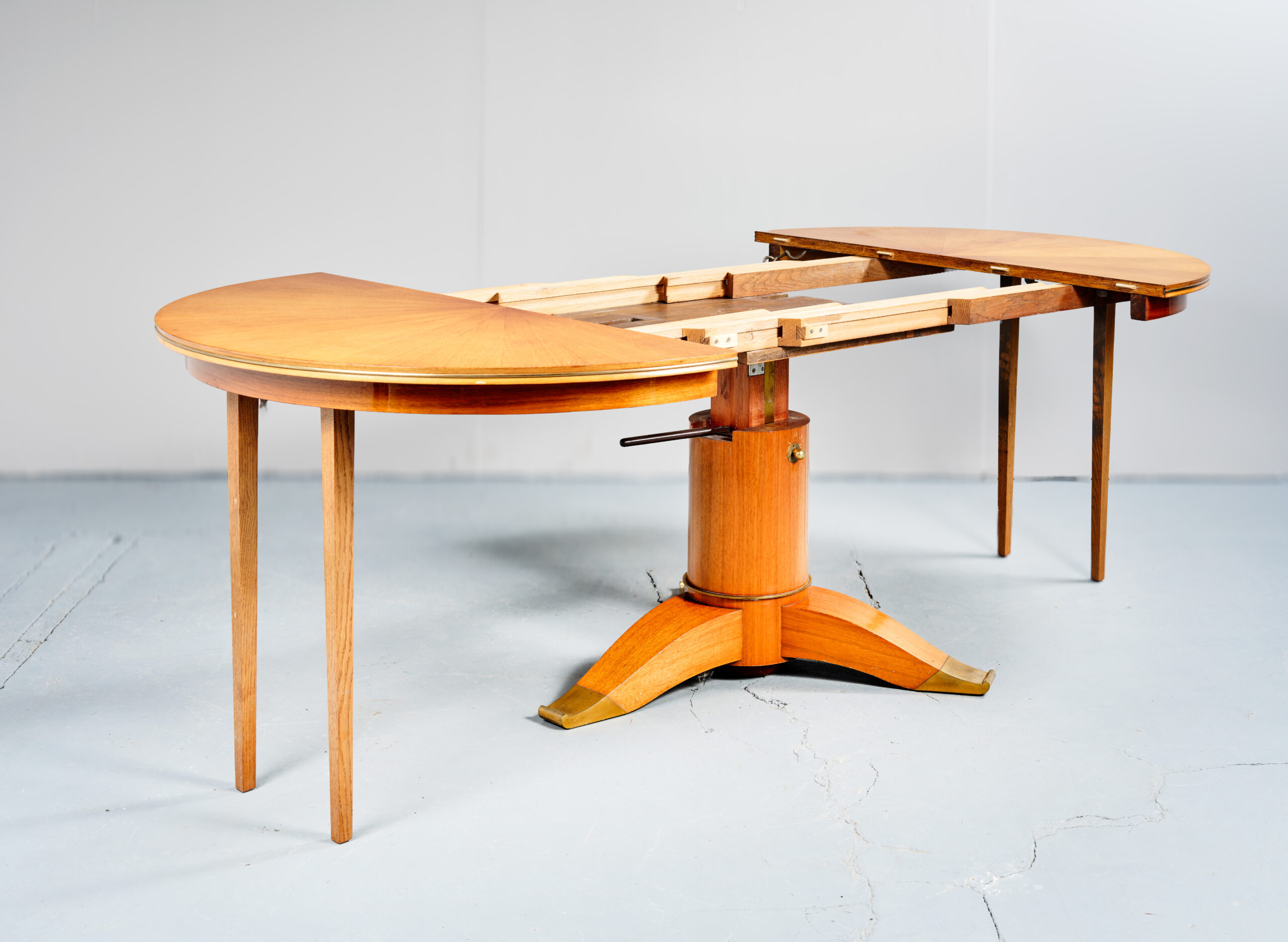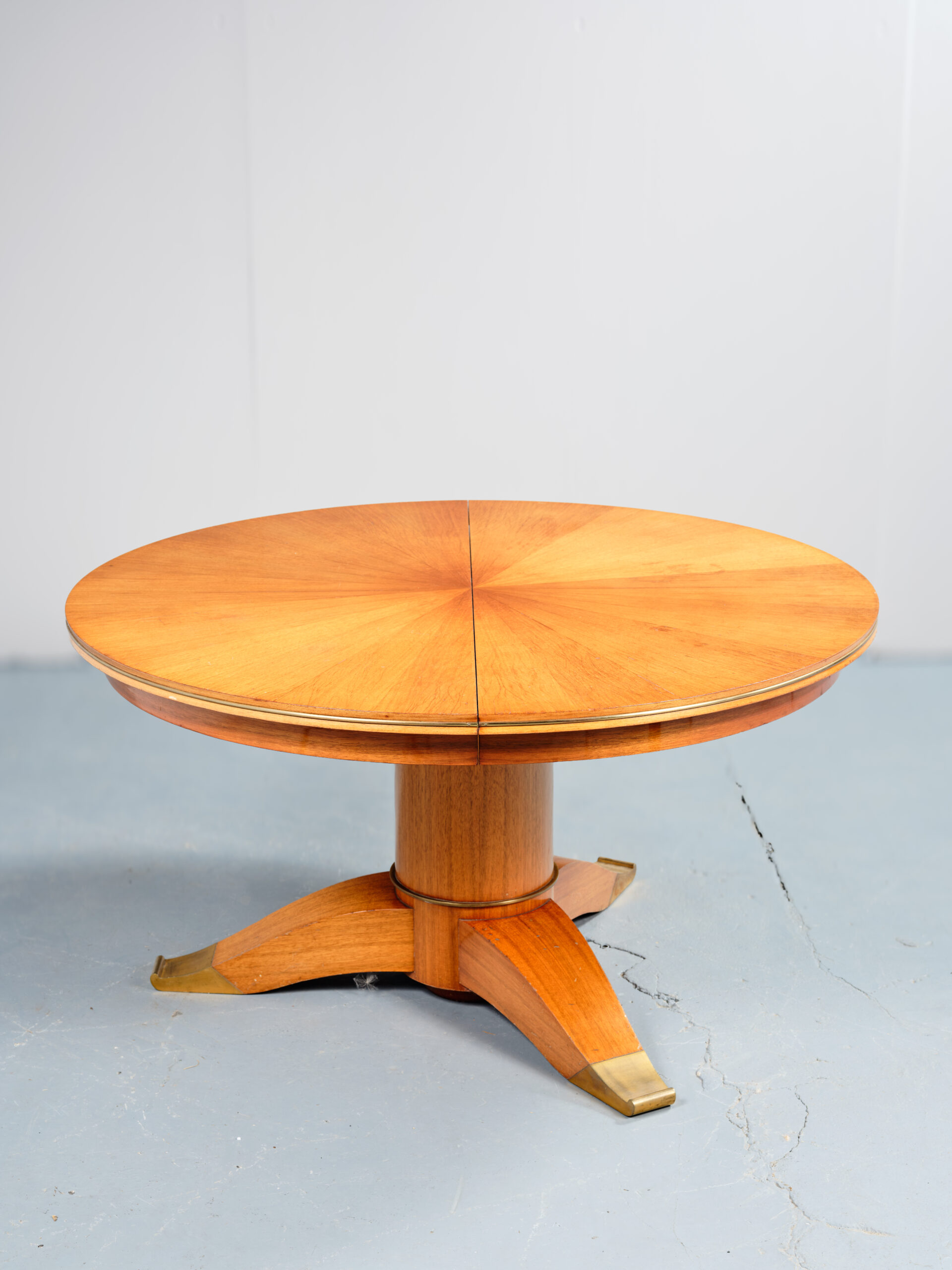 Placage d’acajou blond, plateau circulaire en marqueterie rayonnante.