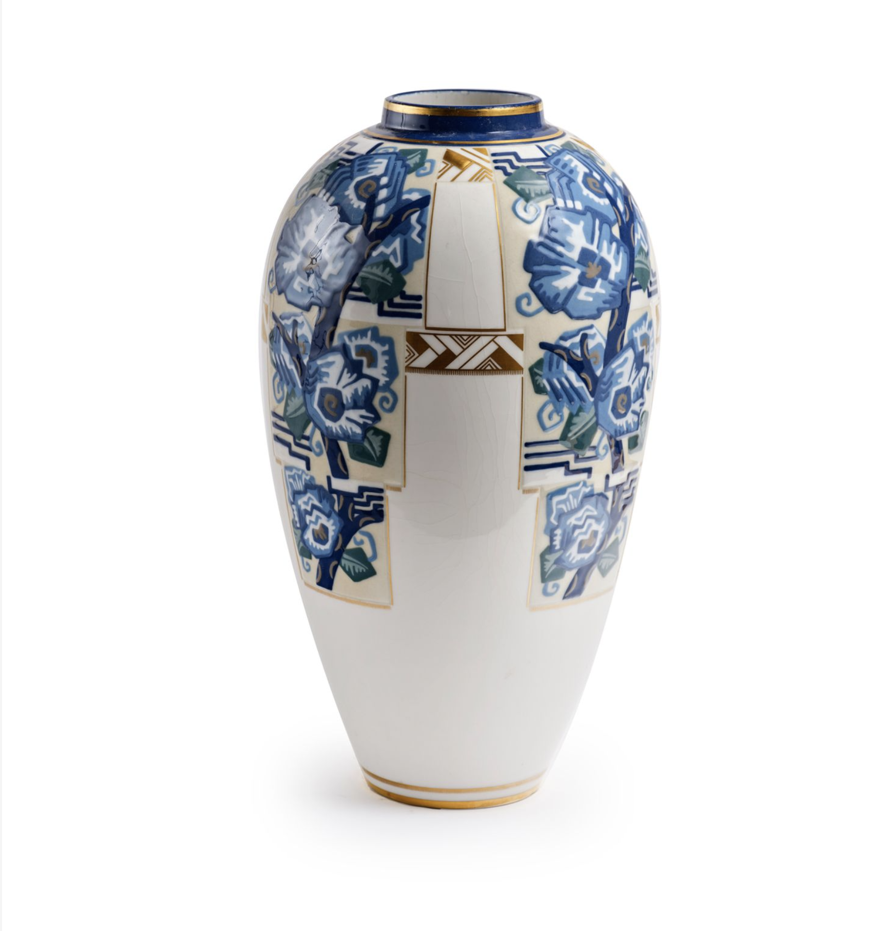 Rare vase de forme ovoïde à col étranglé en porcelaine, décor de motifs floraux et géométriques stylisés bleus et dorés sur fond blanc