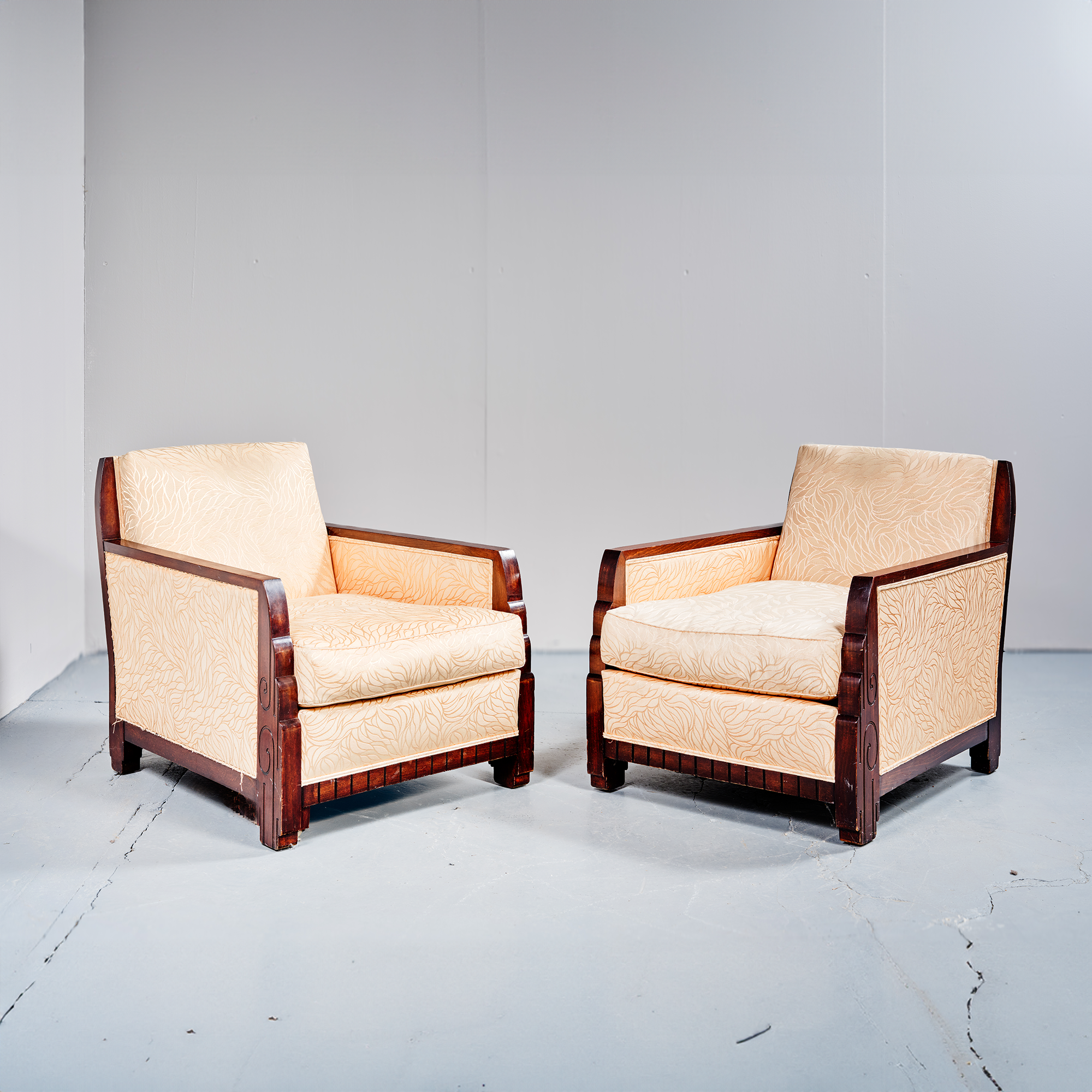 Paire de fauteuils à montants avant à gradins formant motif de cascade, rainurés latéralement de hampes et volutes