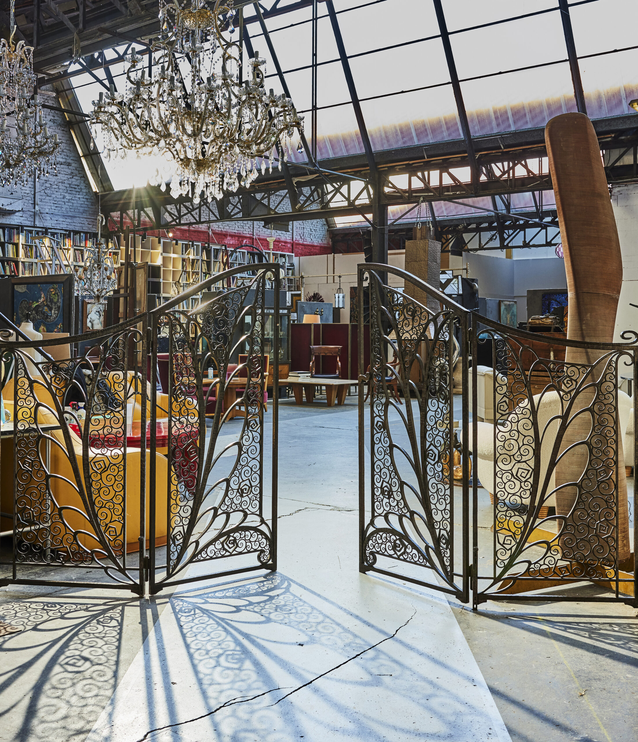 Importante grille de séparation en fer forgé, décor d’enroulements et de palmettes stylisées, ouvrant par quatre battants