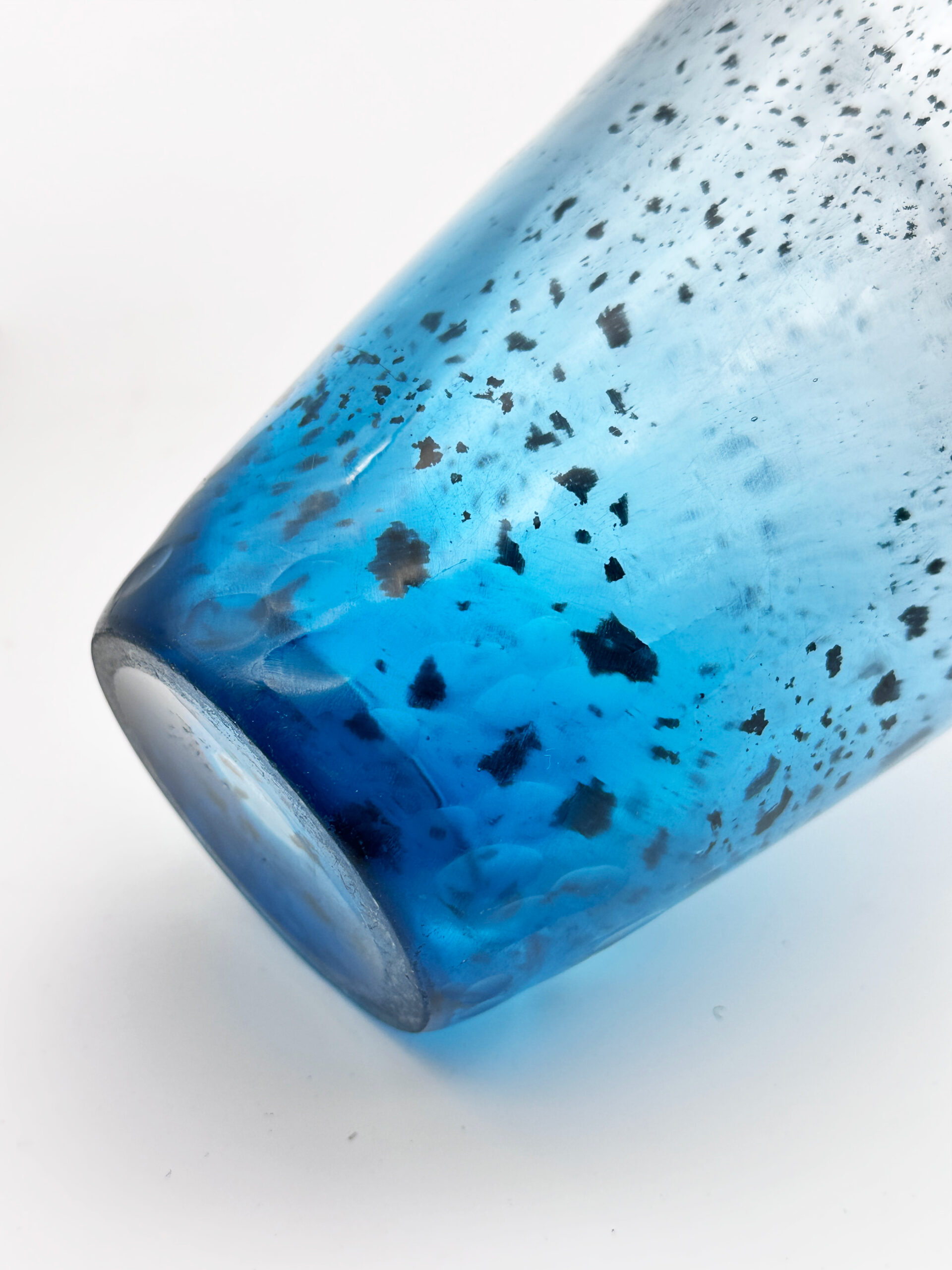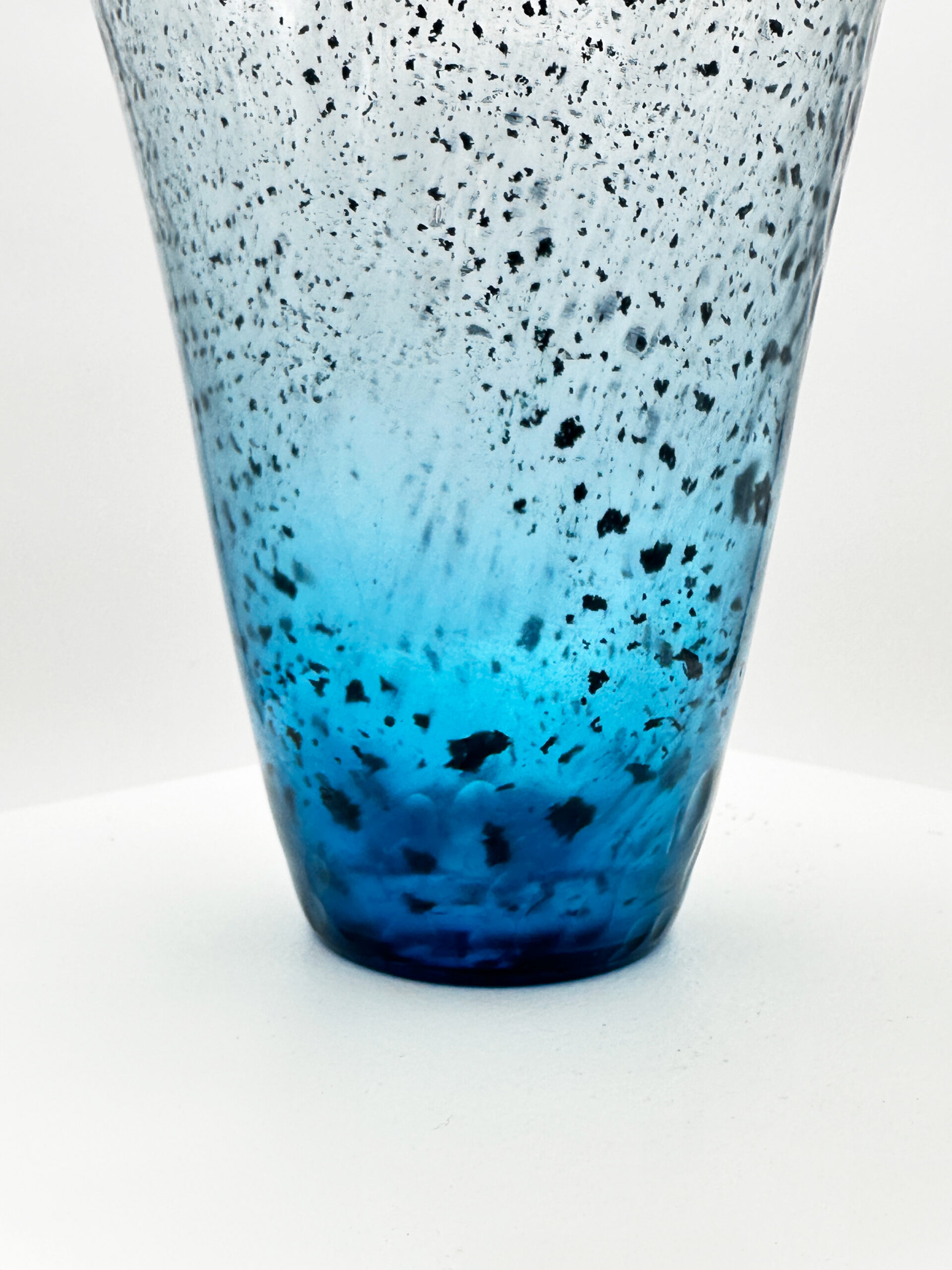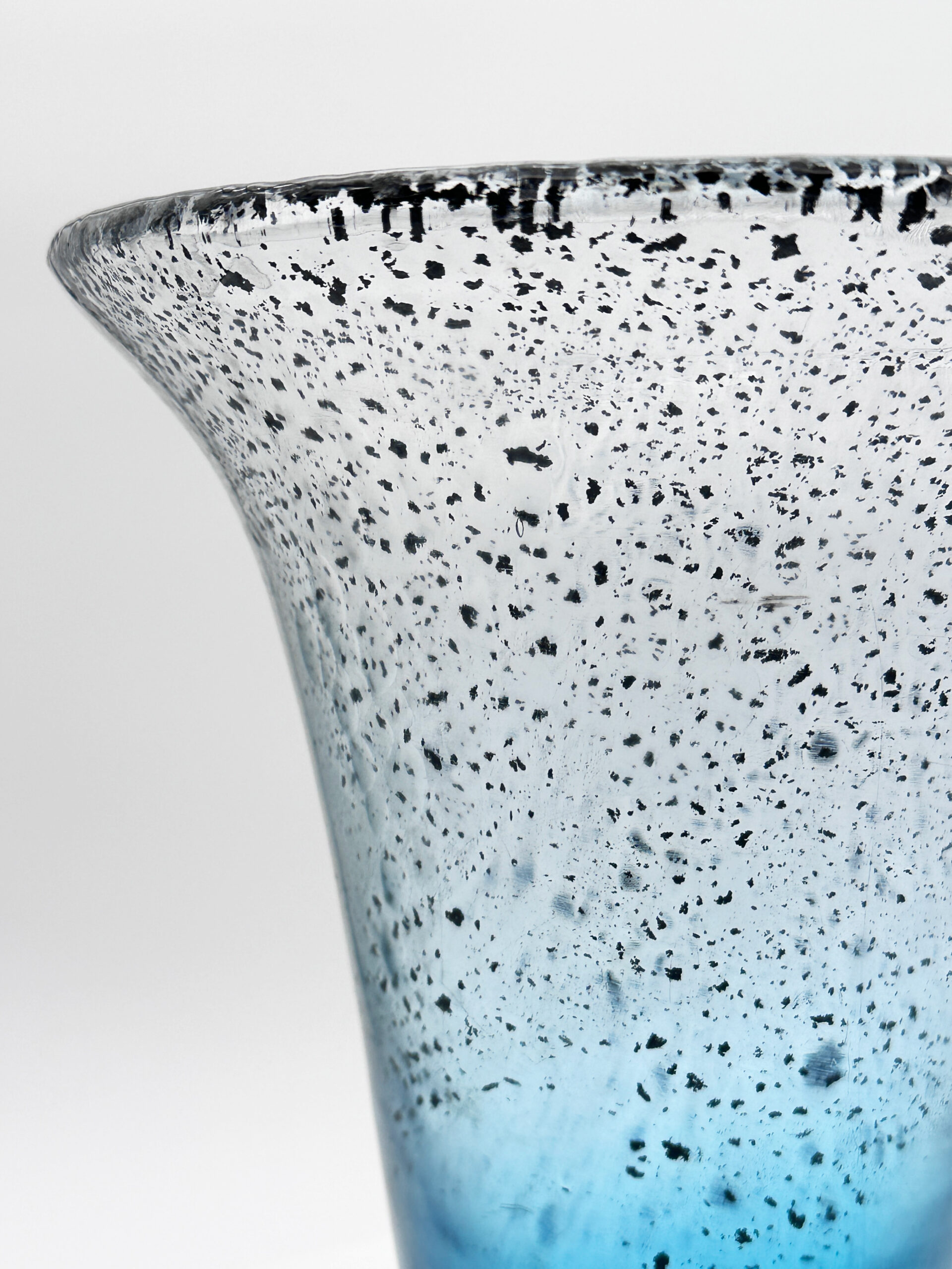 Vase à corps évasé en verre translucide à inclusions d’oxydes métalliques bleus, à surface martelée