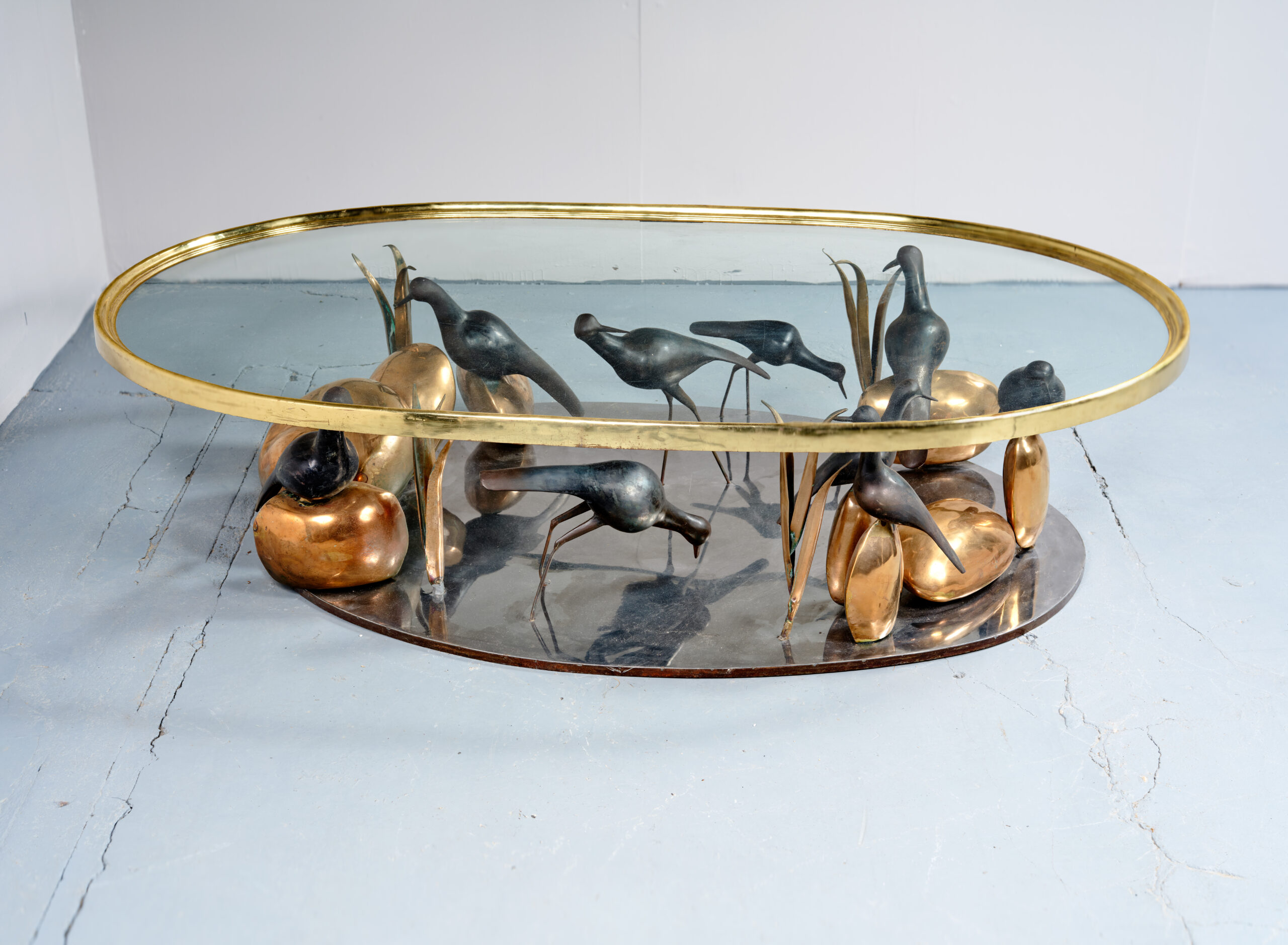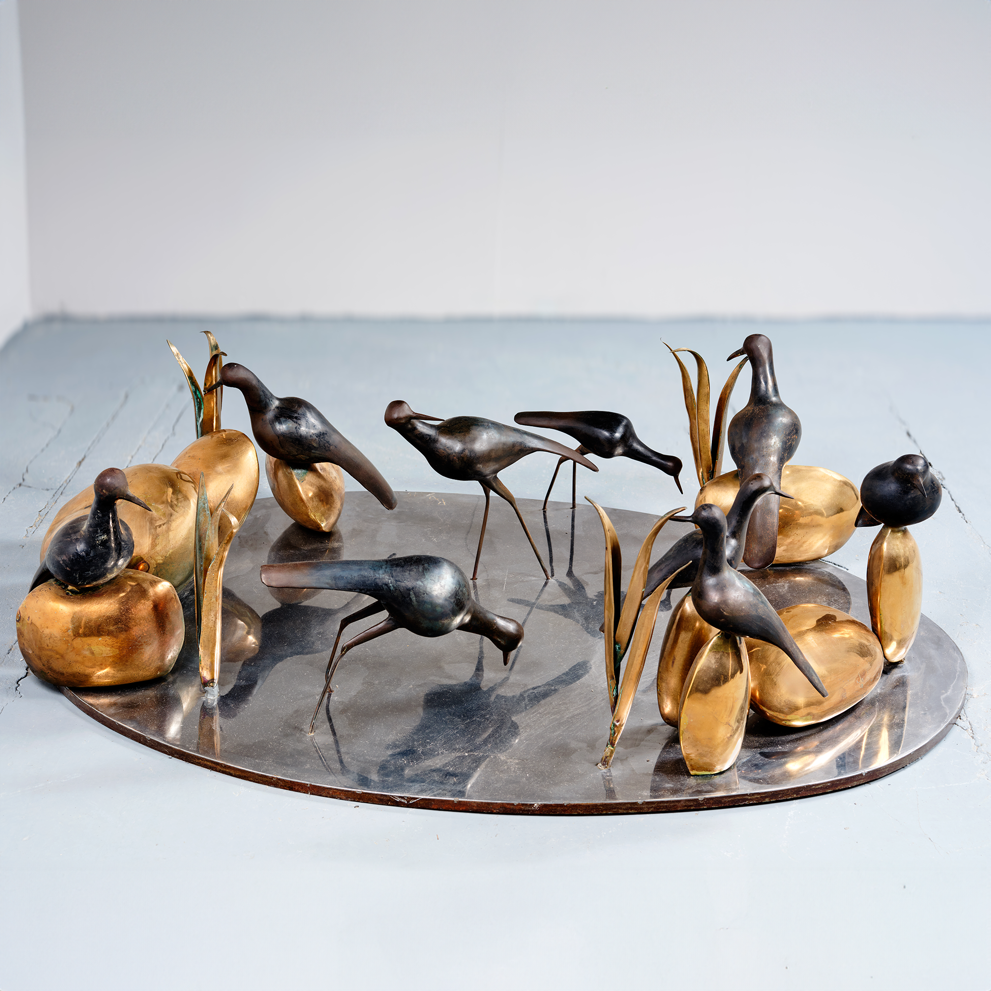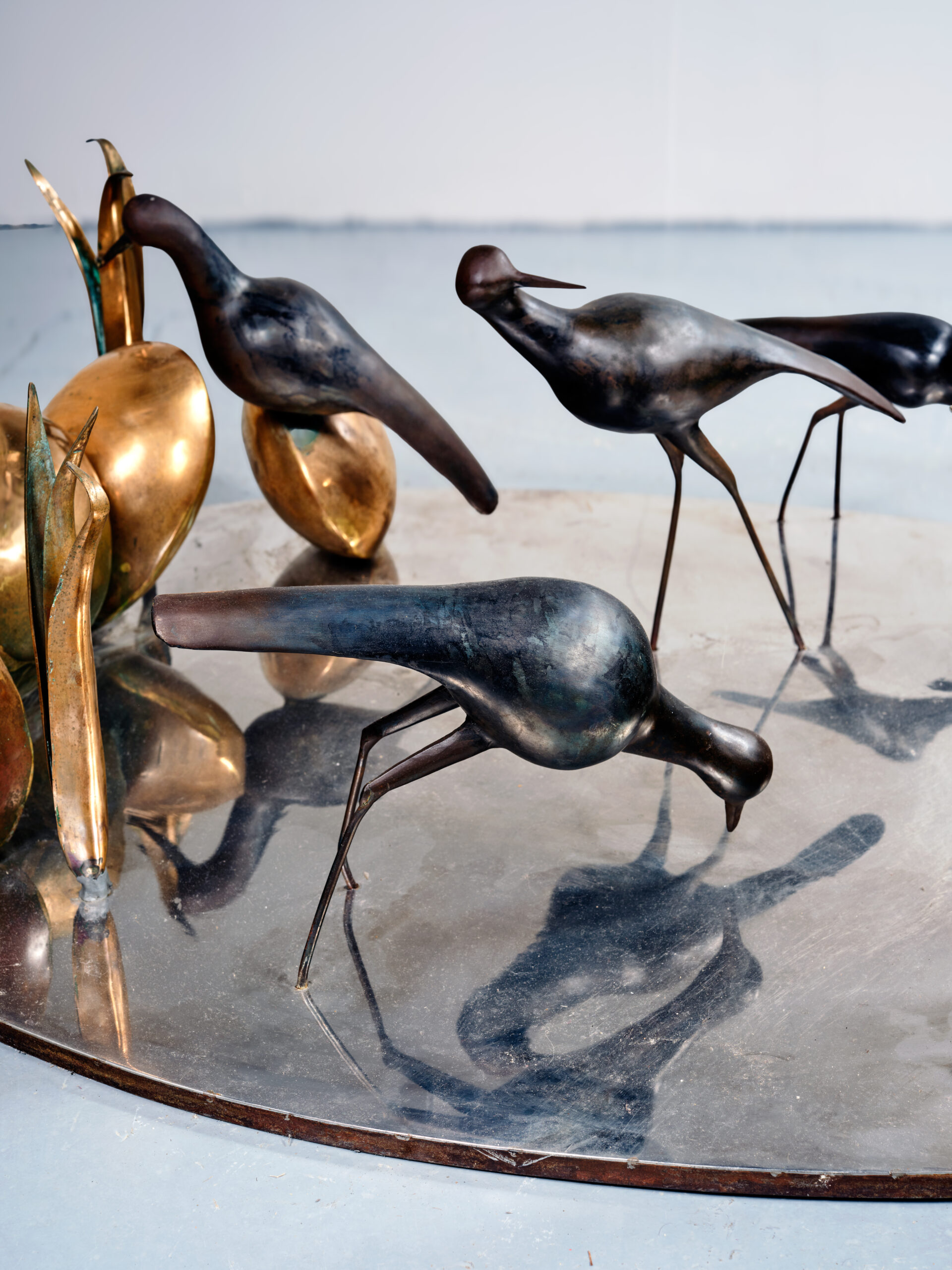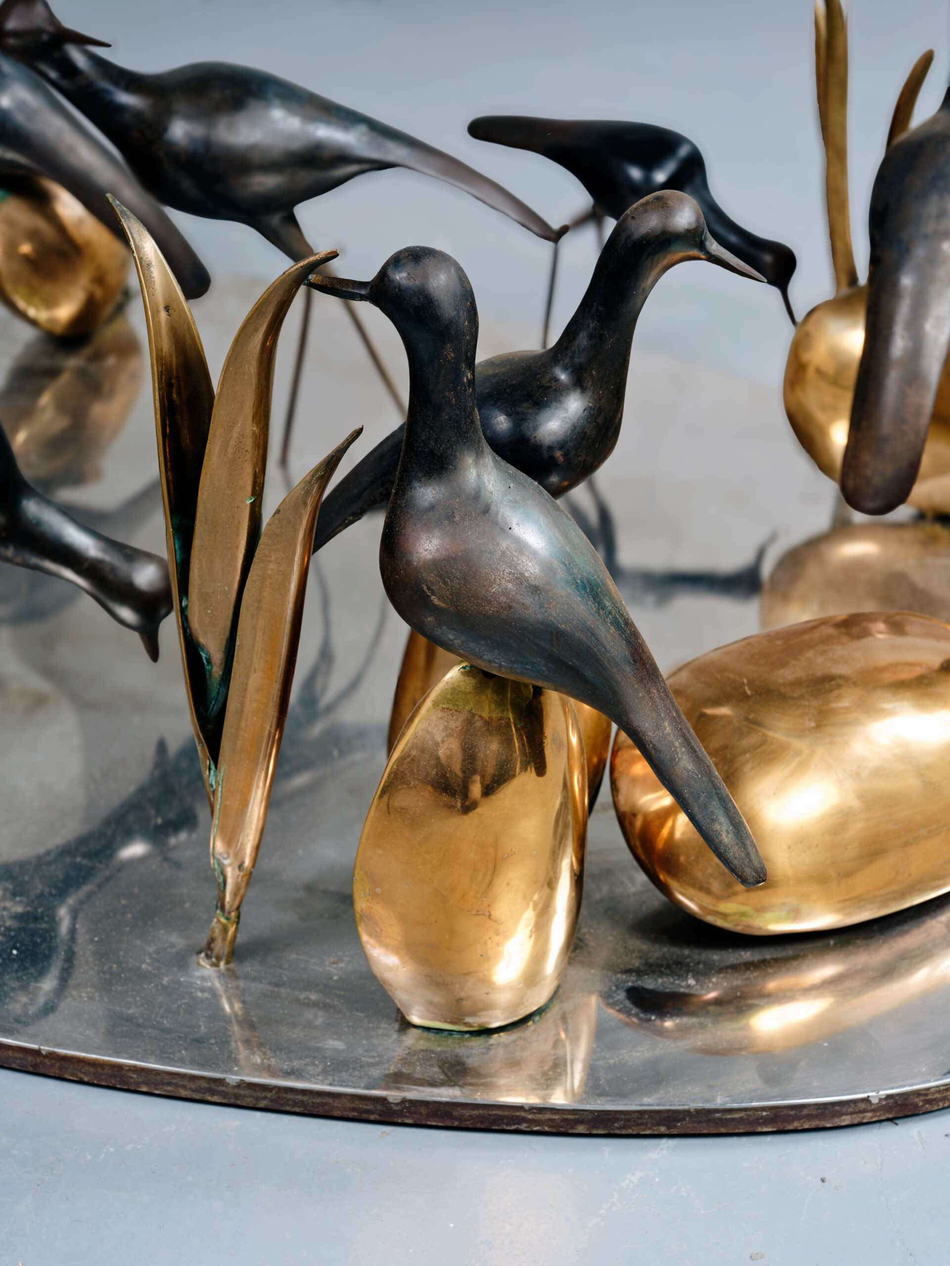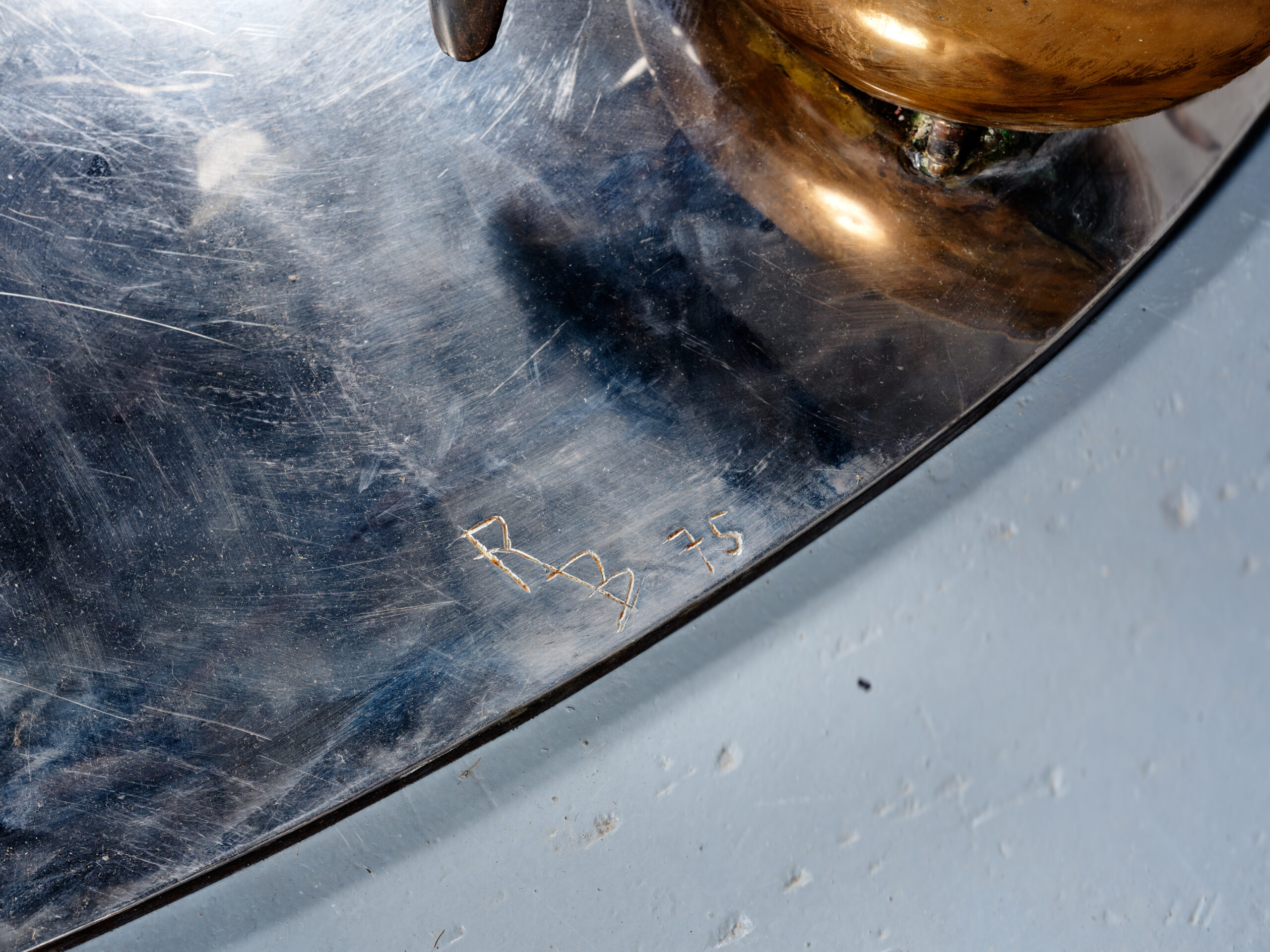 Table basse sculpturale en laiton et métal patiné « canon de fusil »