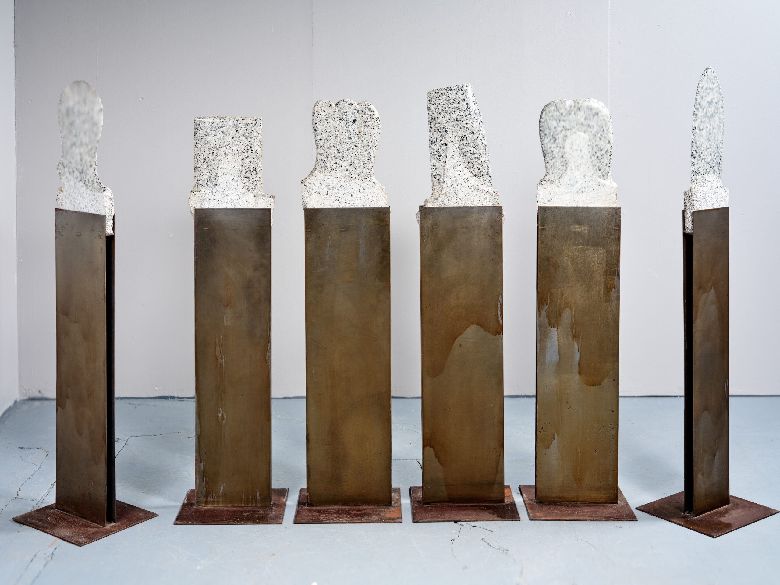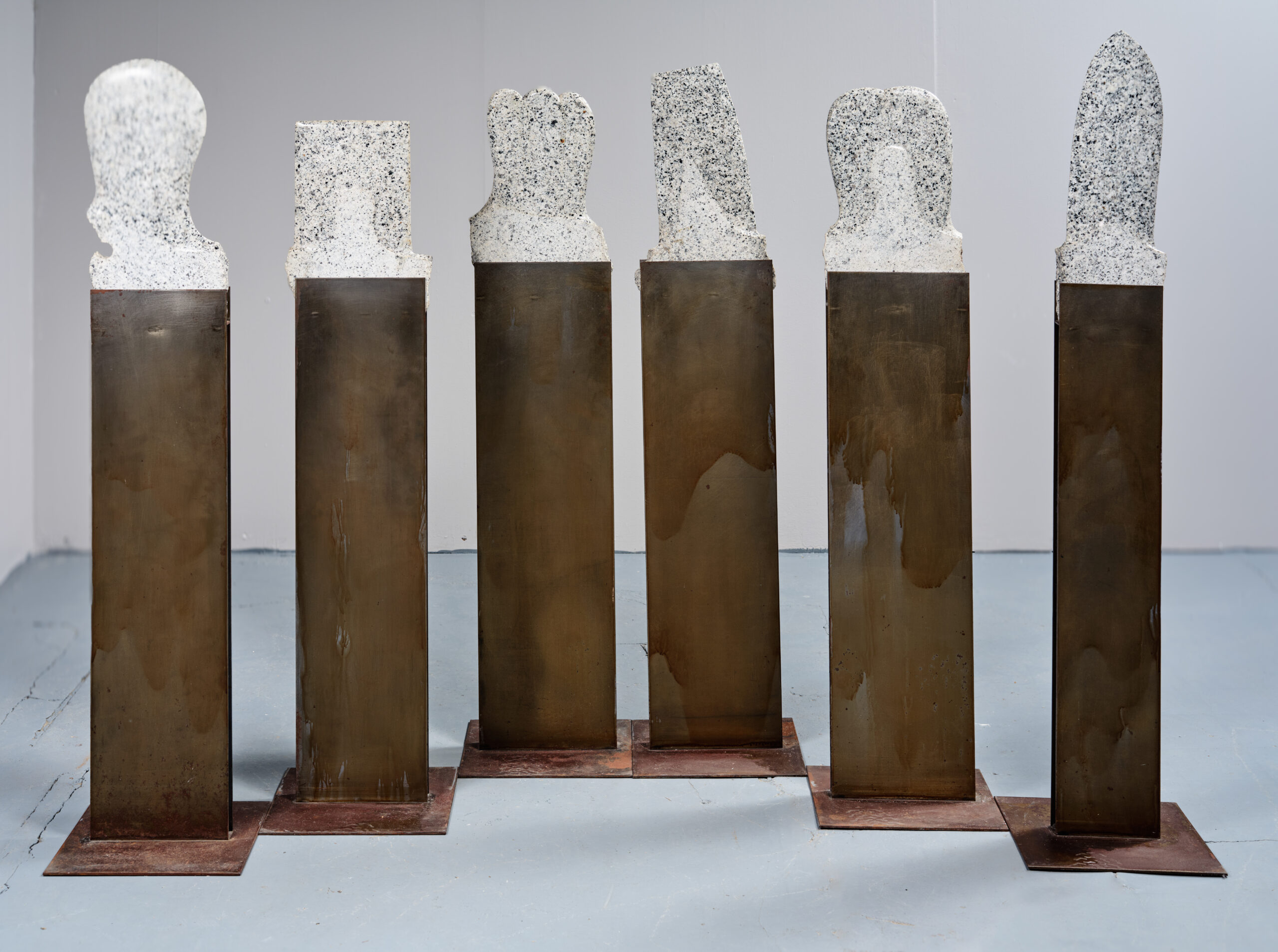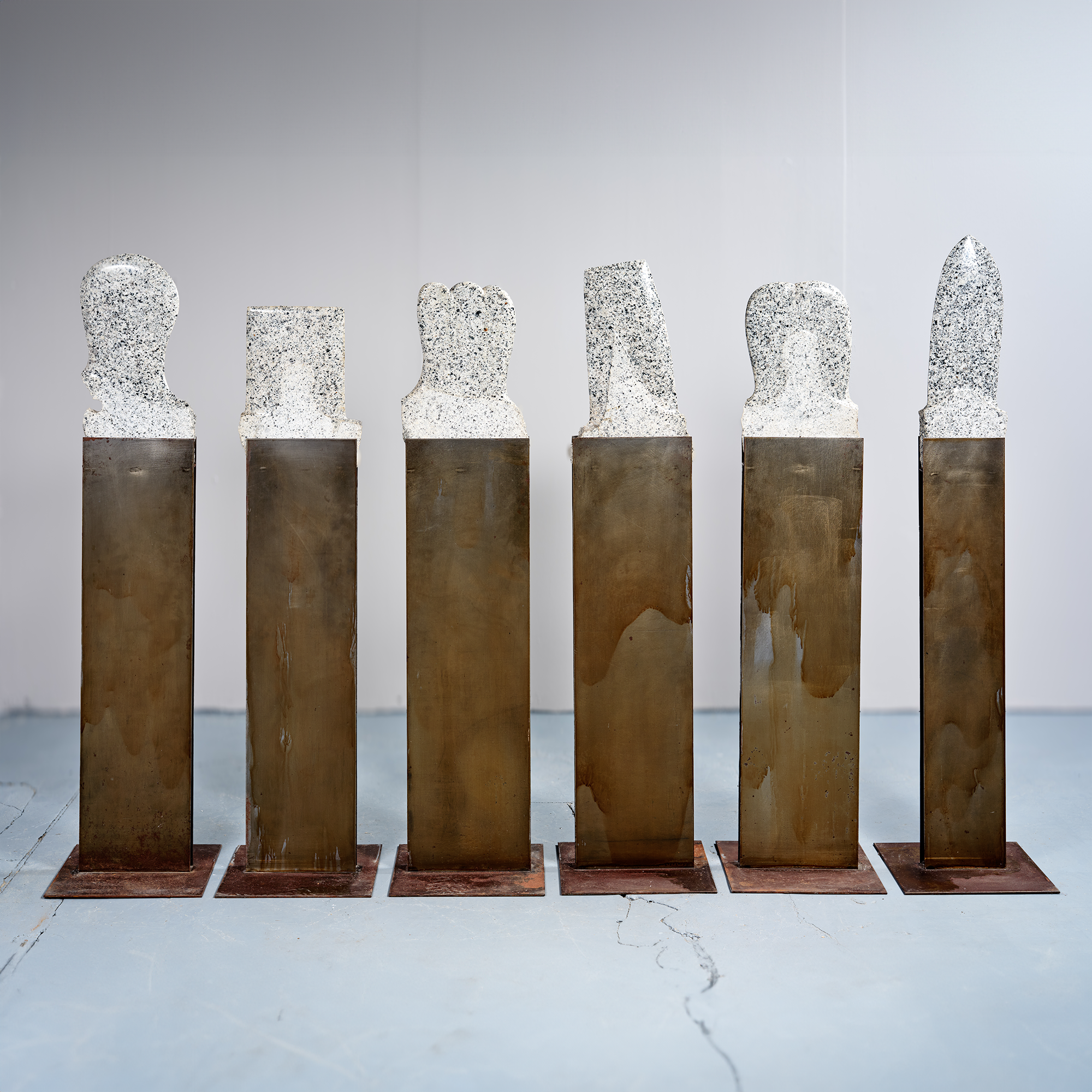 Suite de six totems en granite aux formes élancées et symboliques, évoquant le mouvement, la mer et la naissance. Chaque élément présente un travail minéral précis et une verticalité caractéristique de l’artiste.