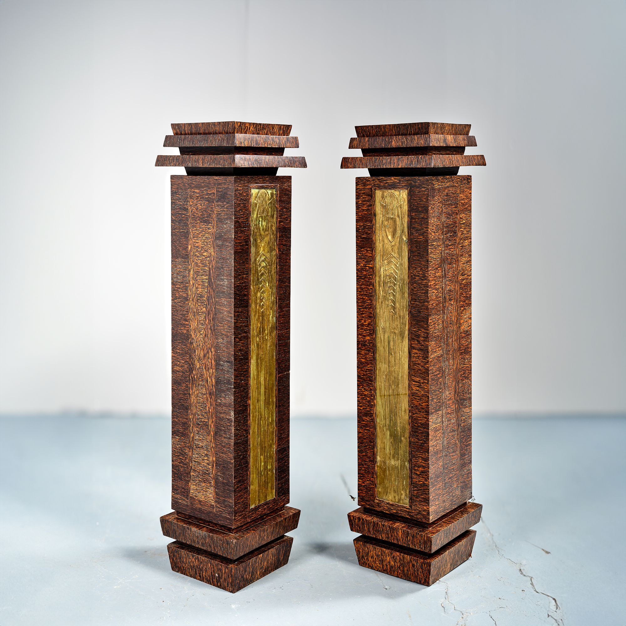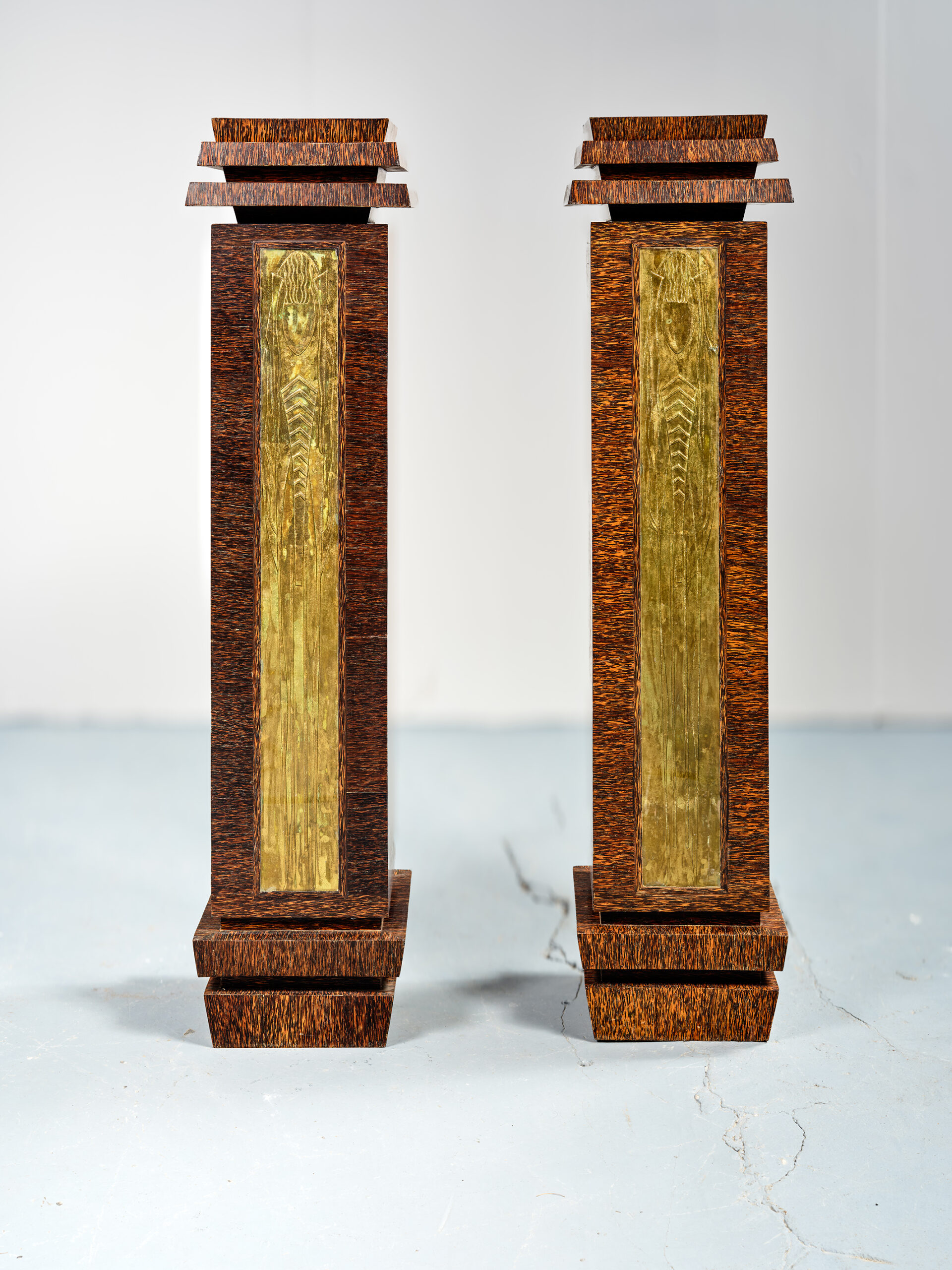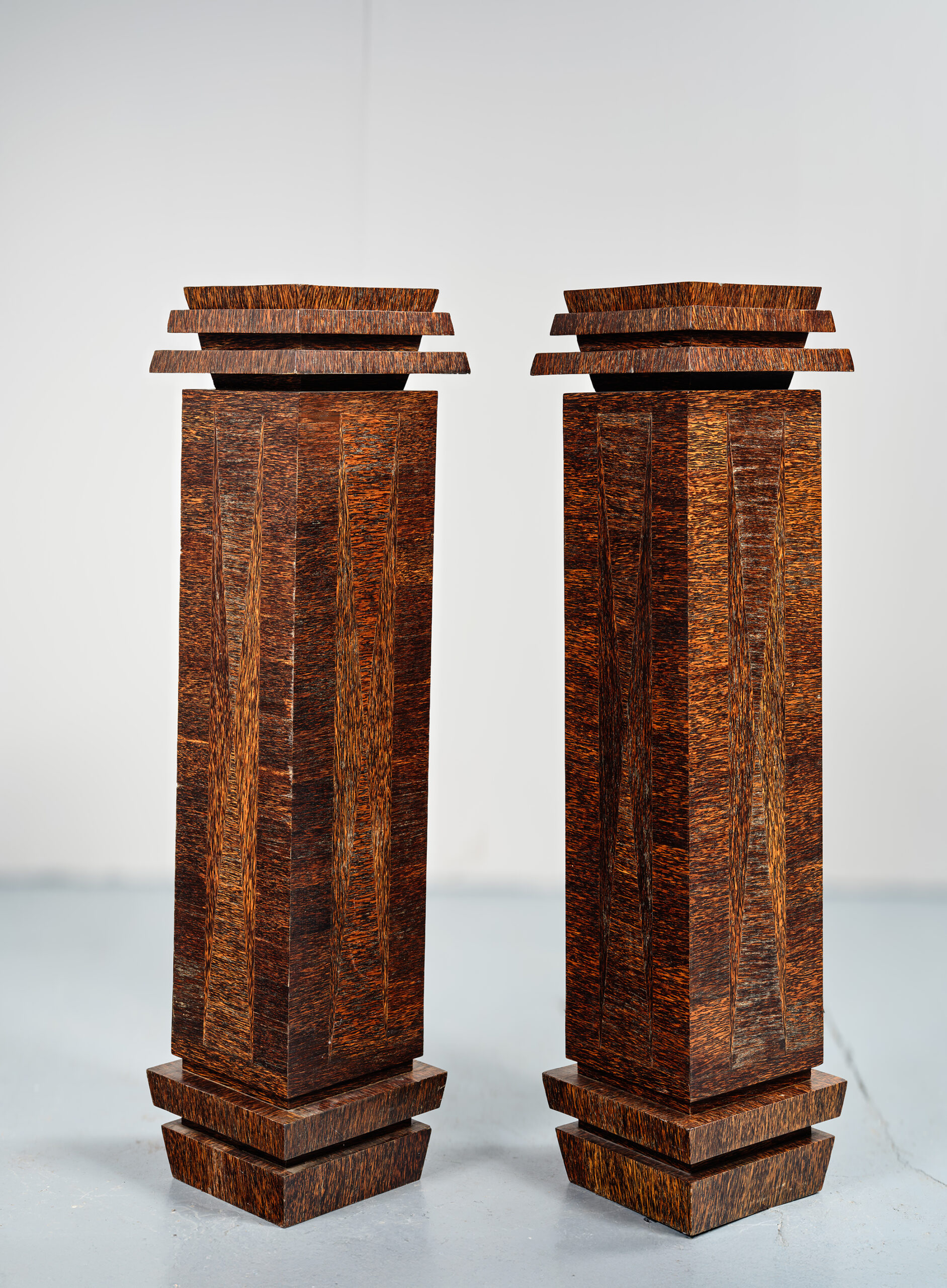 Paire de colonnes « cubistes » en placage de palmier