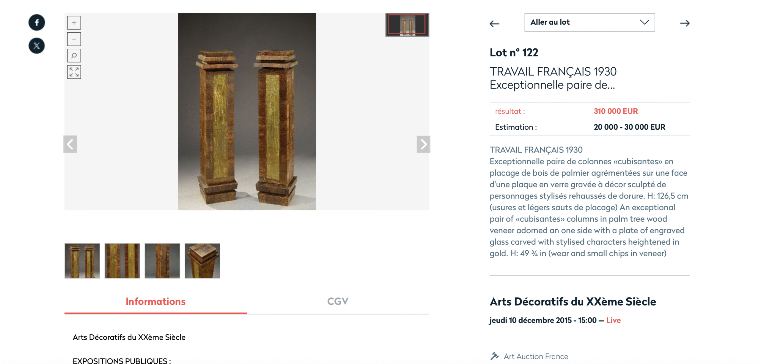 Une paire comparable a été adjugée 395 000 € frais compris le 10 décembre 2015 chez Art Auction France (voir image), témoignant de l’intérêt soutenu des collectionneurs pour ces pièces d’exception.