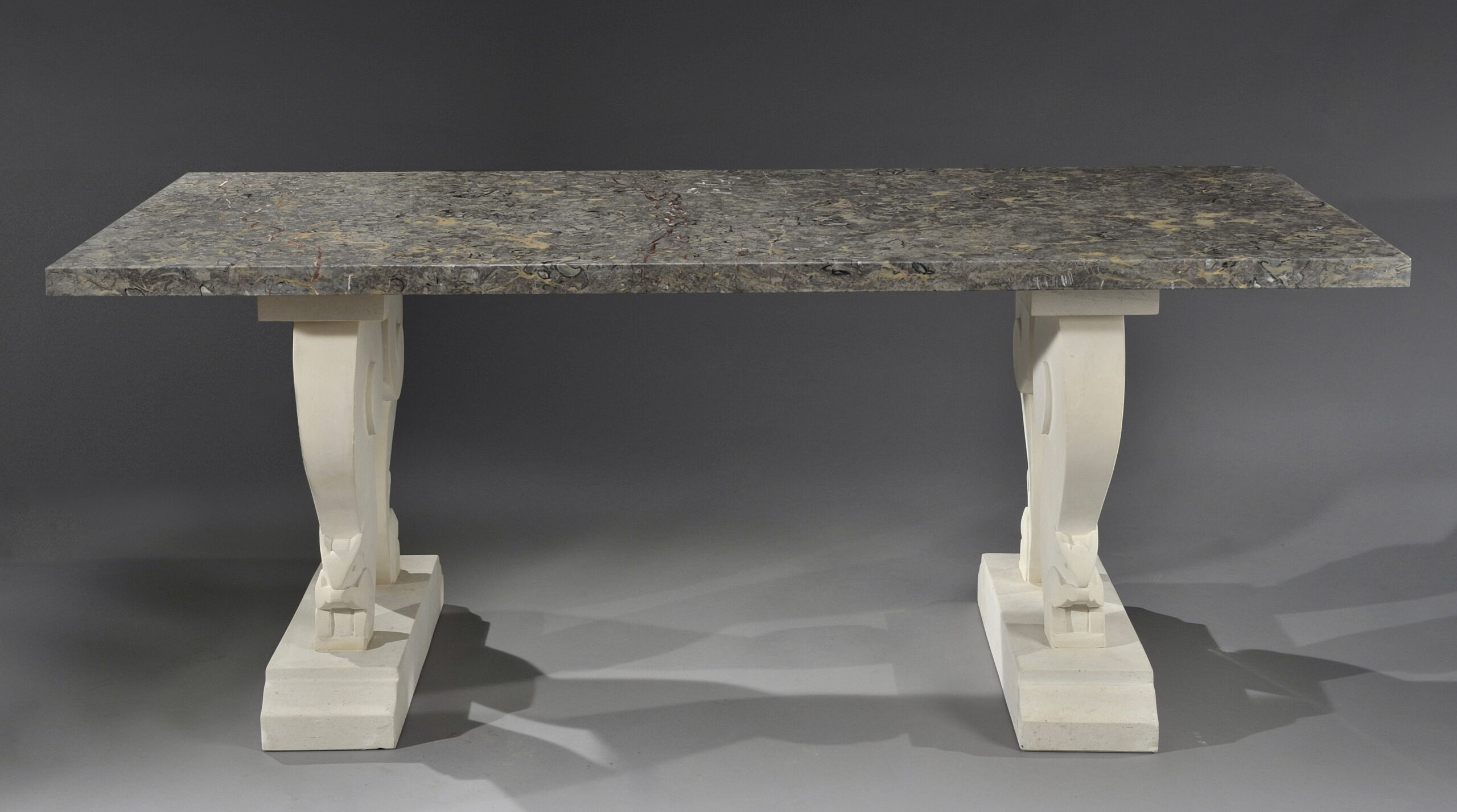 Cette table témoigne de l’esthétique décorative française des années 1925–1930, période marquée par l’essor de l’Art Déco. L’usage combiné du marbre lumachelle et de montants sculptés aux motifs géométrisés — ici des écureuils stylisés — reflète l’intérêt de l’époque pour la synthèse entre artisanat sculptural, matériaux nobles et géométrie modernisée. Ce type de production s’inscrit dans une recherche d’équilibre entre monumentalité, décor architectural et raffinement minéral caractéristique de l’entre-deux-guerres.