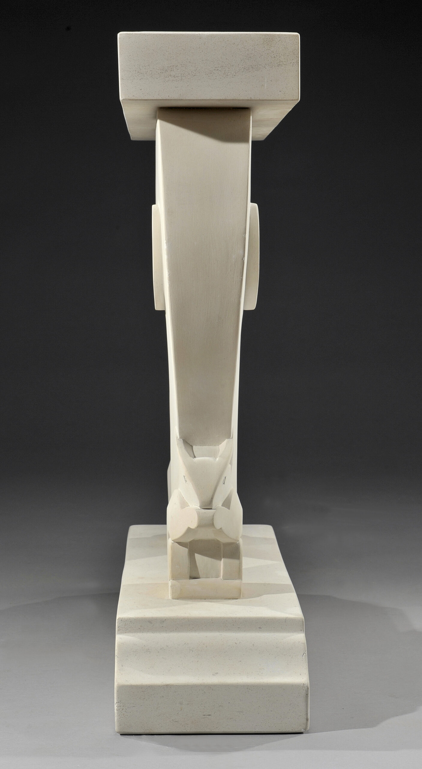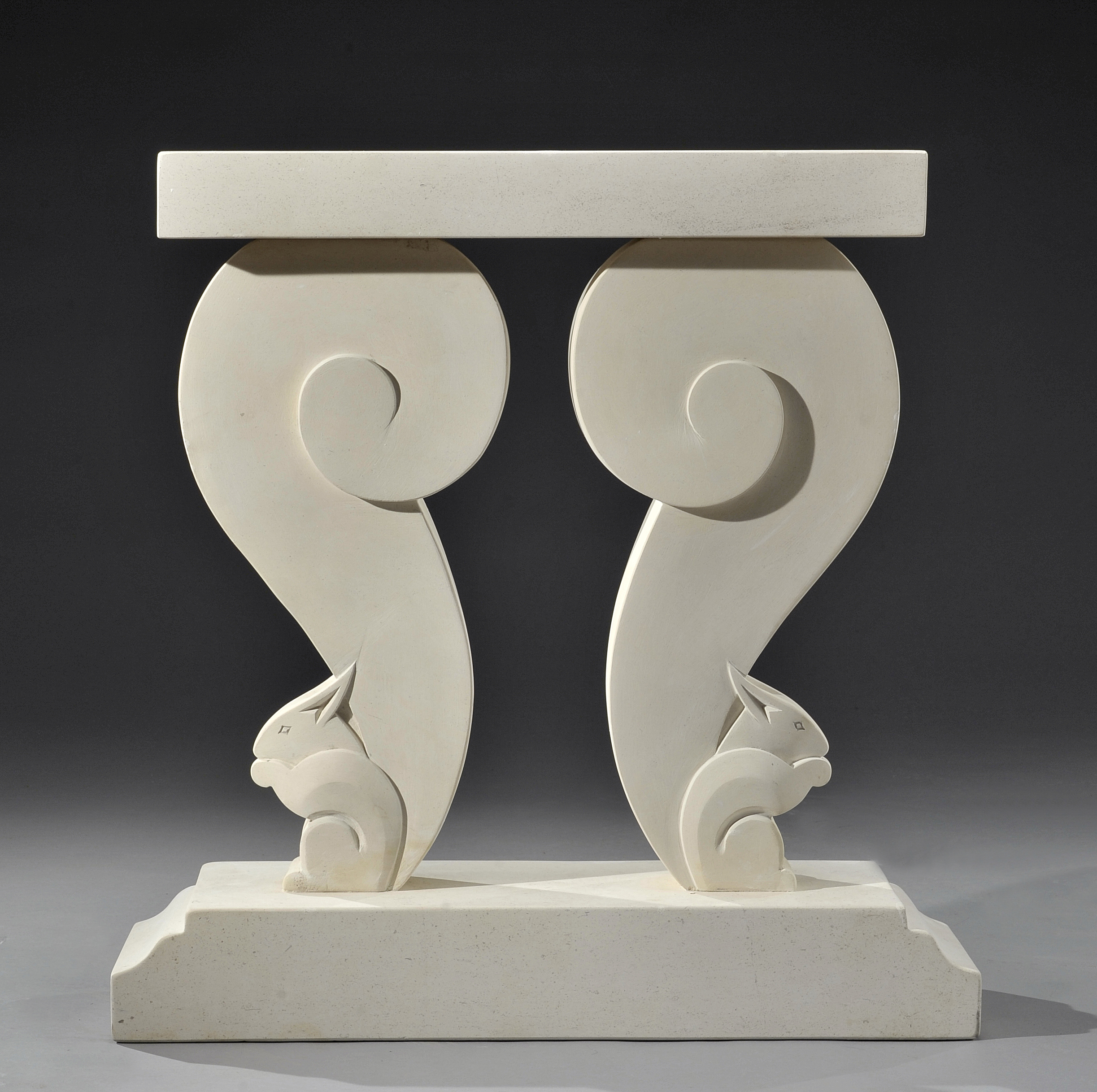 Reposant sur deux montants sculptés en pierre blanche, décorés de motifs d’écureuils cubiques.