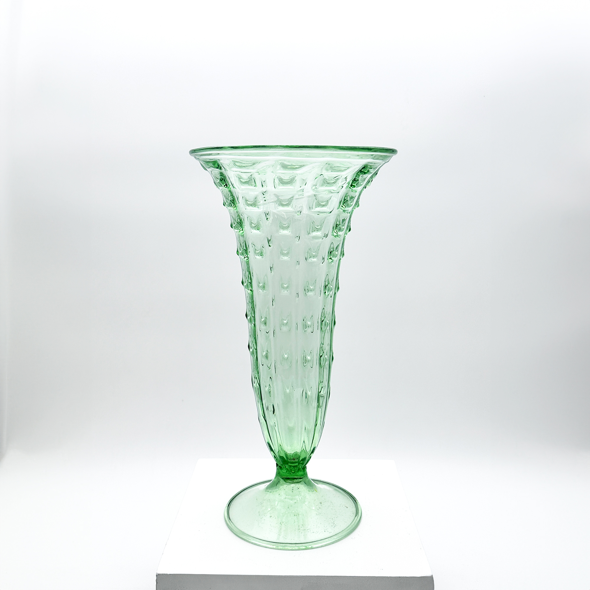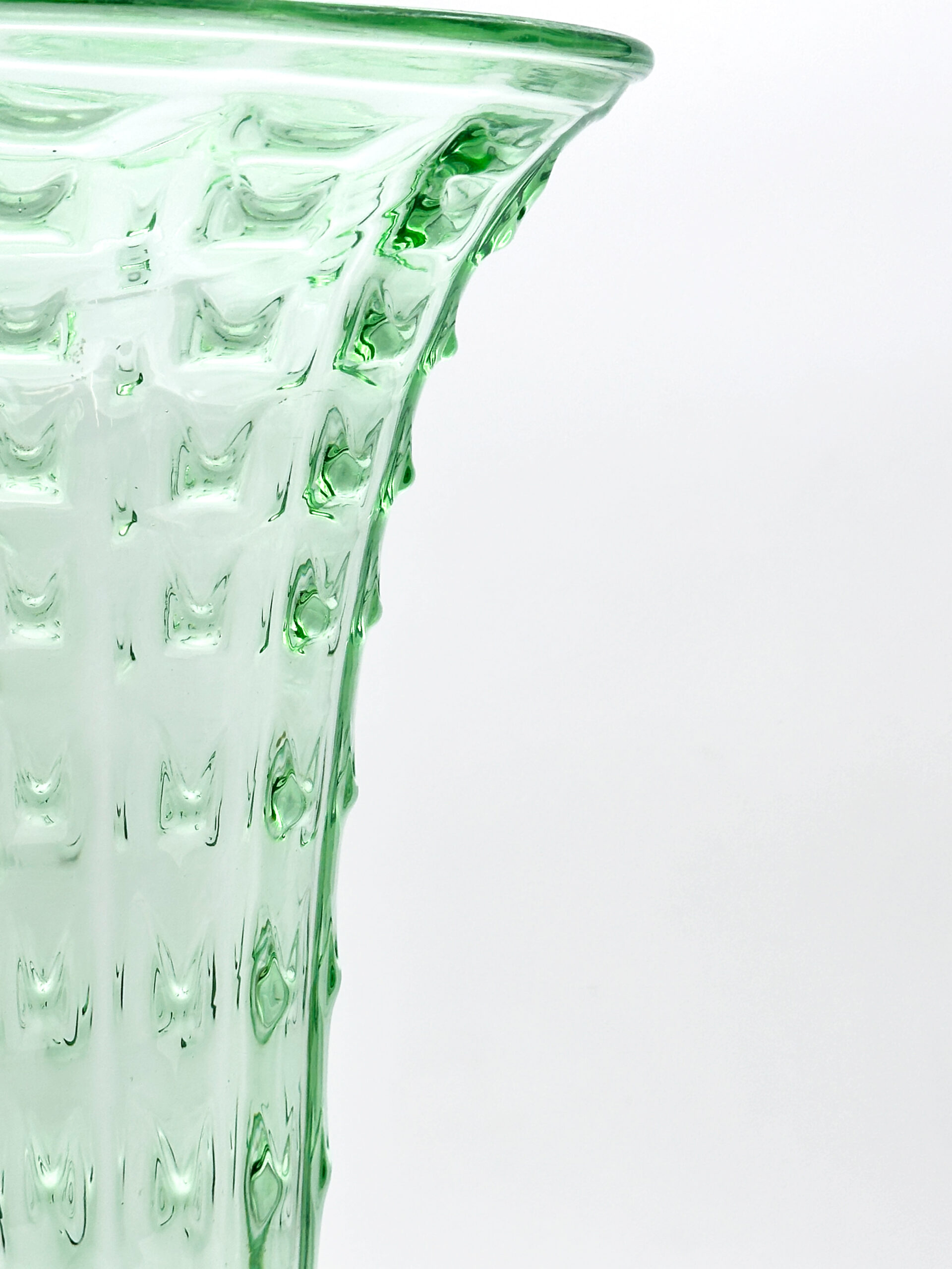 Vase en verre soufflé de couleur verte, sur pied évasé