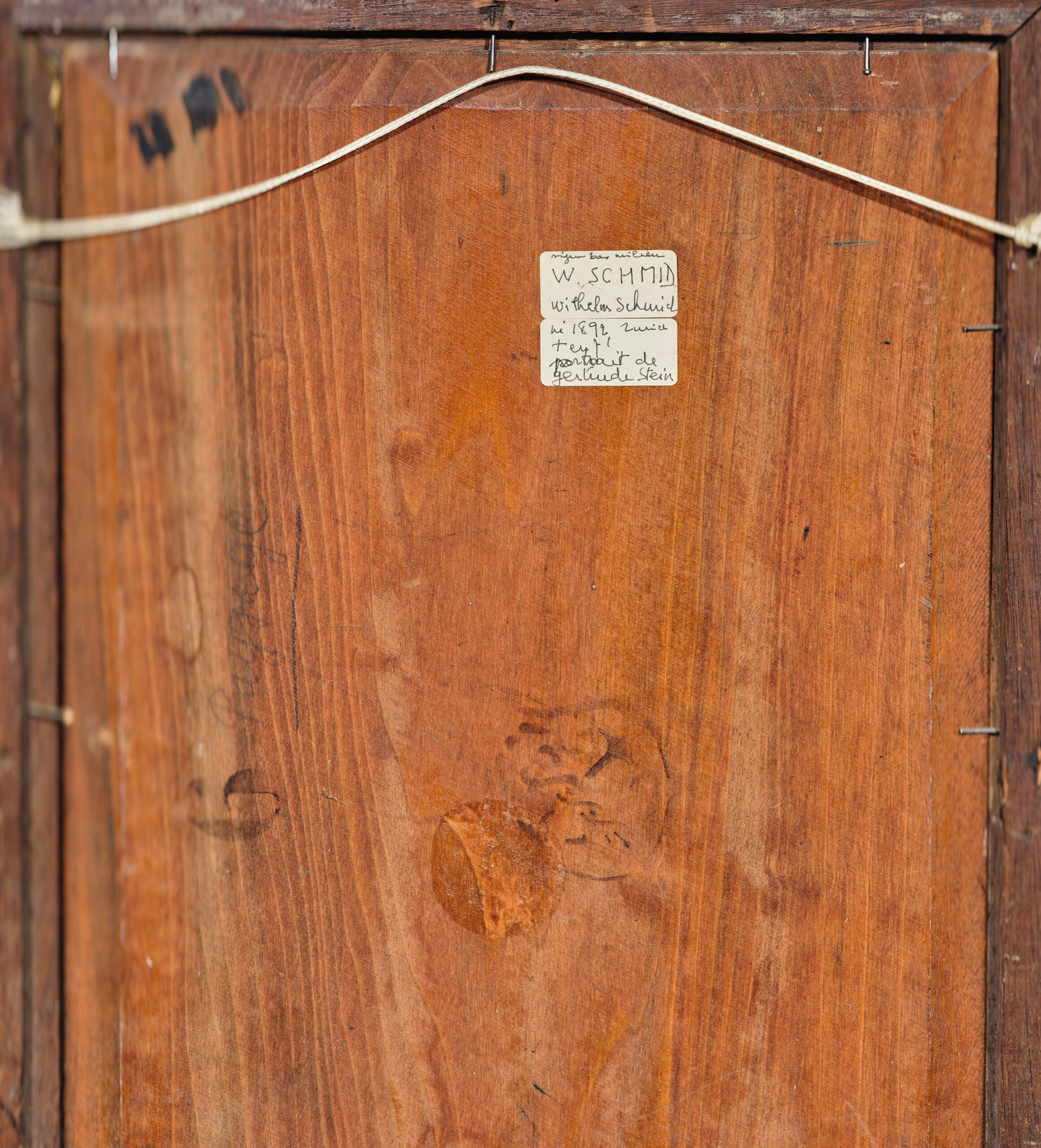 Peintre d’origine autrichienne actif au début du XXᵉ siècle, Wilhelm Schmid s’intéresse aux portraits et aux figures intellectuelles de son époque. Son travail s’inscrit dans un contexte artistique marqué par les échanges entre Paris, Vienne et Berlin, où l’expérimentation stylistique et la modernité psychologique jouent un rôle central. Le choix de représenter Gertrude Stein témoigne de l’écho que la célèbre écrivaine et mécène exerça dans les milieux artistiques européens.